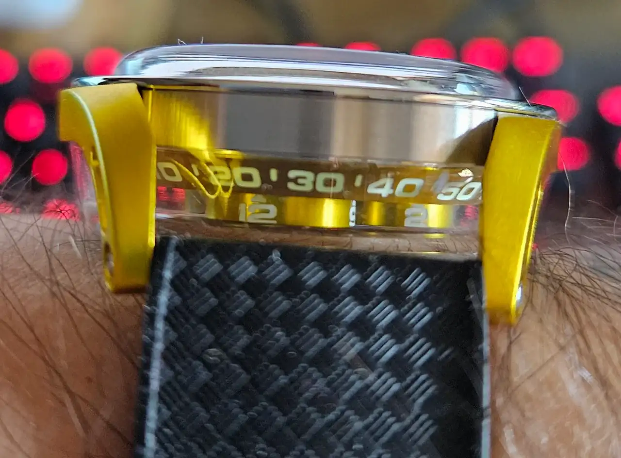 Parece mentira pero queda fijado con rigidez total. Como veis el tornillo central está un pelín tocado (aunque es por la foto, en vivo no se ve así) y es porque ya he peleado con él. Como decía las asas se pueden desmontar e intercambiar. El reloj venía con unas asas de acero cepillado, y las he cambiado por las que veis, de aluminio anodizado, que en mi opinión quedan mucho mejor y hacen al reloj tremendamente ligero. Al ser de aluminio y zafiro, se siente como un reloj de titanio. Todo el sistema wandering hour también es de aluminio.