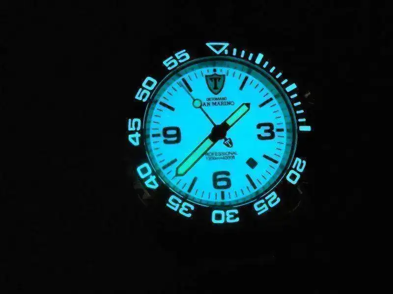 Armis macizo tipo anvil de 24mm. Esfera blanca radiactiva. Válvula de escape de He. Con extensión para traje de buceo.