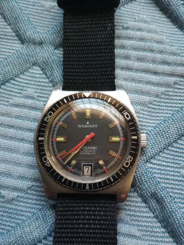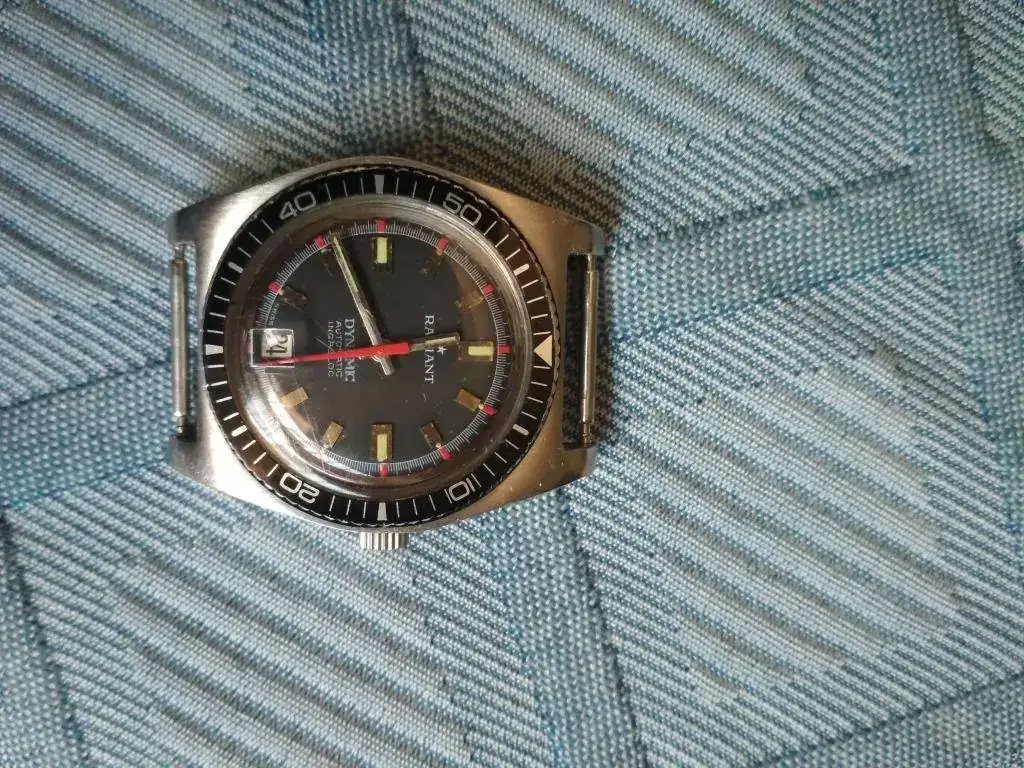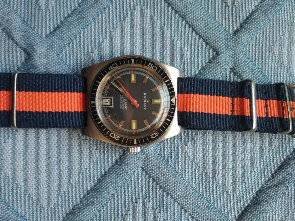 Vendo reloj vintage Radiant Dynamic tipo diver automatico.El reloj está en un estado muy bueno..Funciona muy bien..lo único que para cambiar la fecha cuesta bastante,, Debe ser por algún problema de la tija que no engrana bien, pero se le da cuerda y se pone en hora perfectamente.se entrega con una nato negra un poco desgastada. y otra naranja y azul...en el precio se incluye el envío..gracias