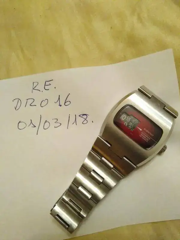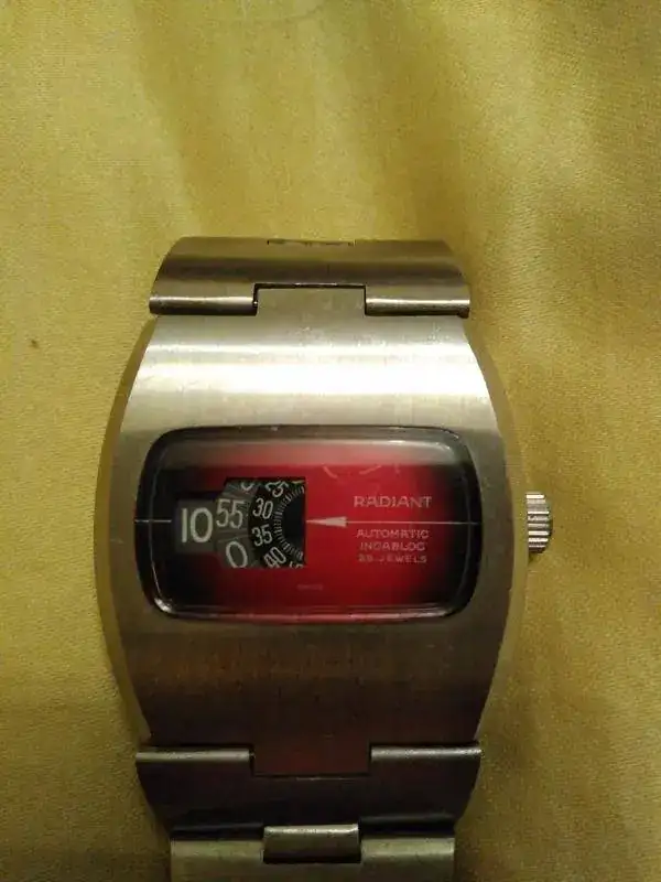 Ofrezco este reloj marca Radiant automático con maquinaria AS 2072 y atrayente esfera granate degradada de claro al centro a más oscuro hacia los extremos.