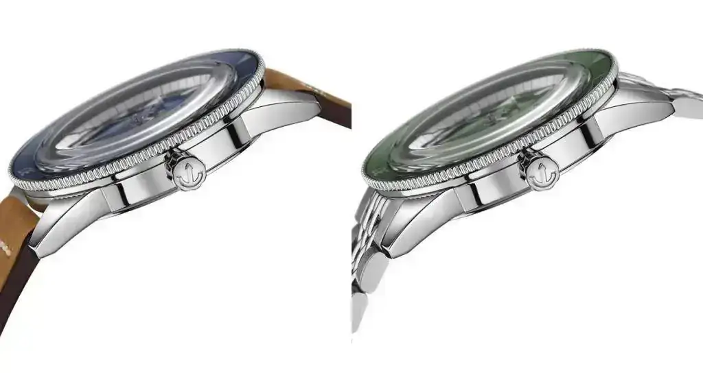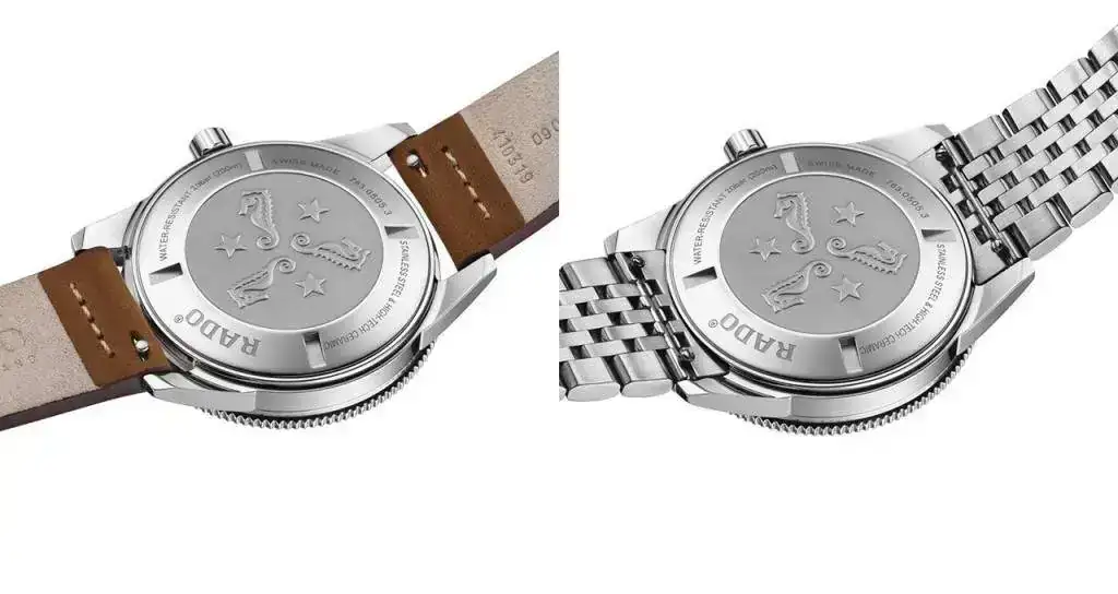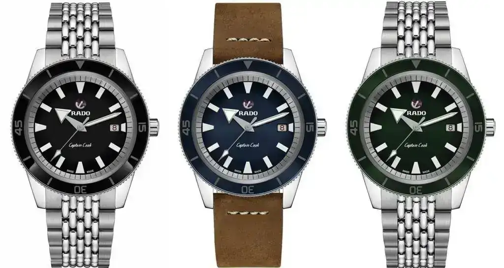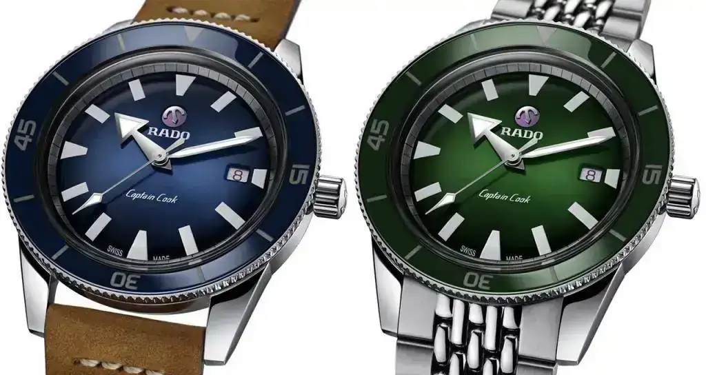 colección Captain Cook, cuyos relojes tienen la esfera y el anillo a juego. El cristal de zafiro, introducido por primera vez en el modelo Diastar 1 de 1962 y que ahora se utiliza en todos los relojes Rado, sustituye al vidrio acrílico del modelo original y aporta resistencia a los arañazos, al tiempo que mantiene la forma de caja abombada.