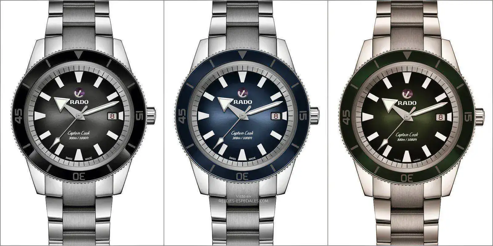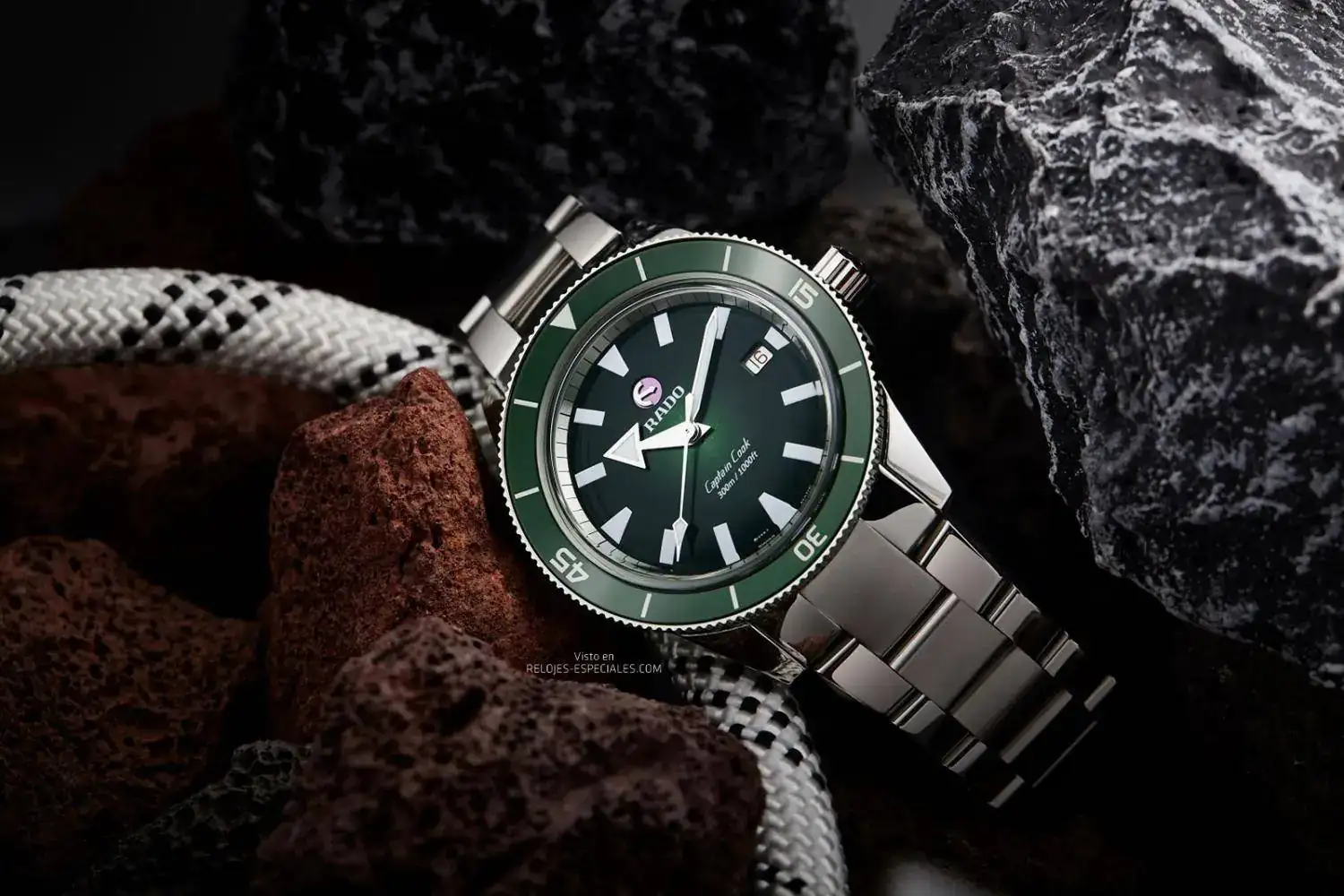 Logotipos de Rado, “Captain Cook” y “300m/1,000ft” de color blanco