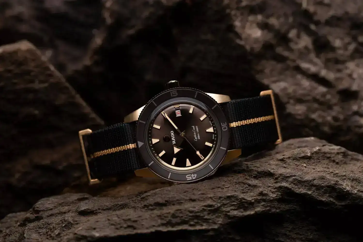 Dejando de lado por esta vez su "seña de identidad" (esto es, materiales super-duros para las cajas) Rado lanzó una edición de su Captain Cook en bronce, cómo no. Un bronce que combina cobre y aluminio, lo que le da un tono más pajizo que el más habitual conteniendo estaño. Como tiende a reaccionar (ya sabemos, la pátina) su fondo es de titanio, metal mucho más estable, prácticamente inerte.