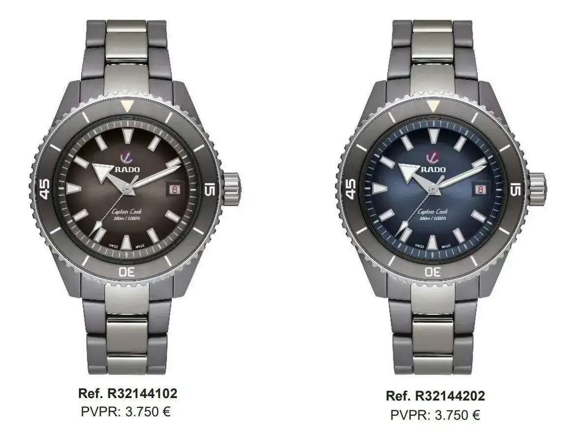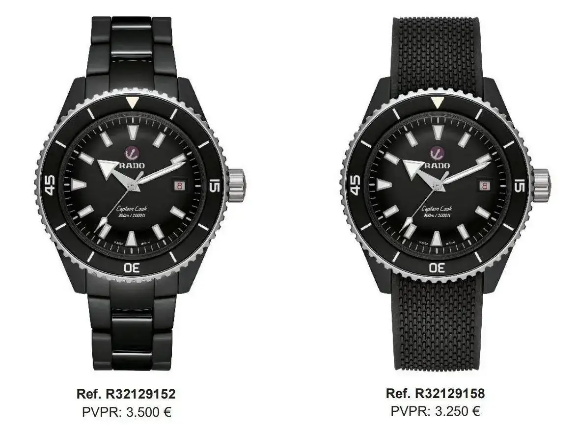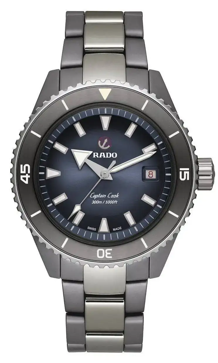Logotipo de Rado e inscripciones “Captain Cook” y “300m/1000ft” de color blanco