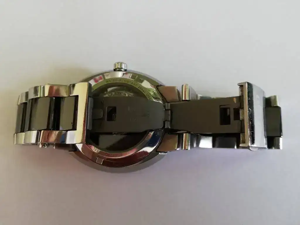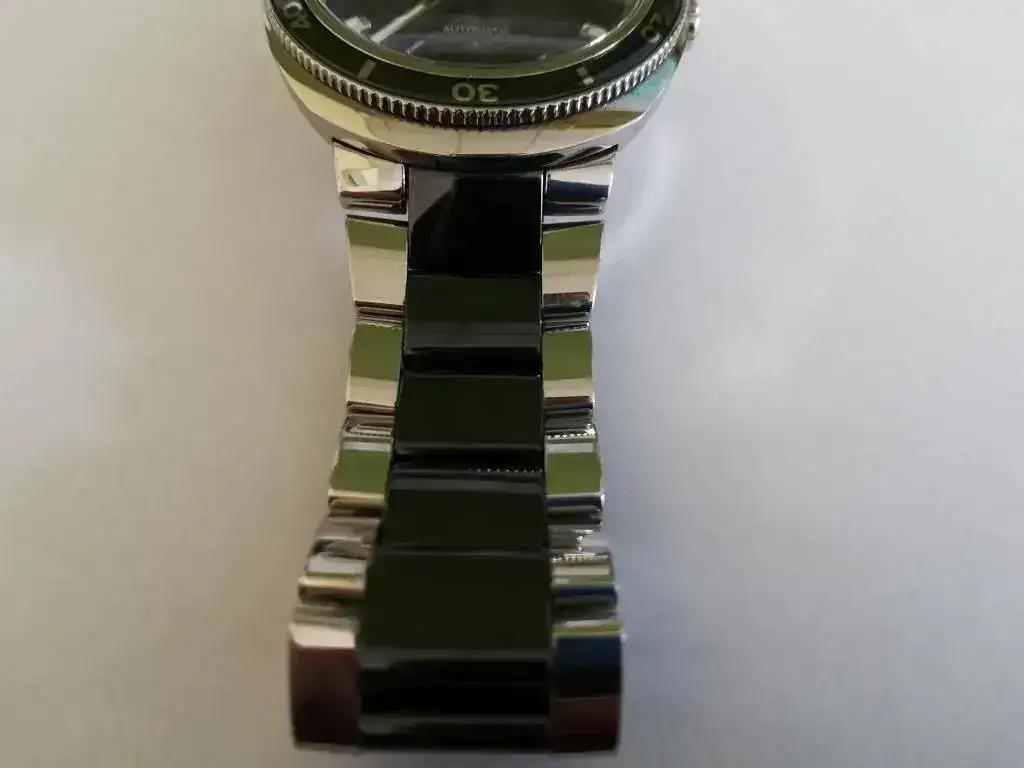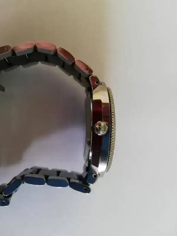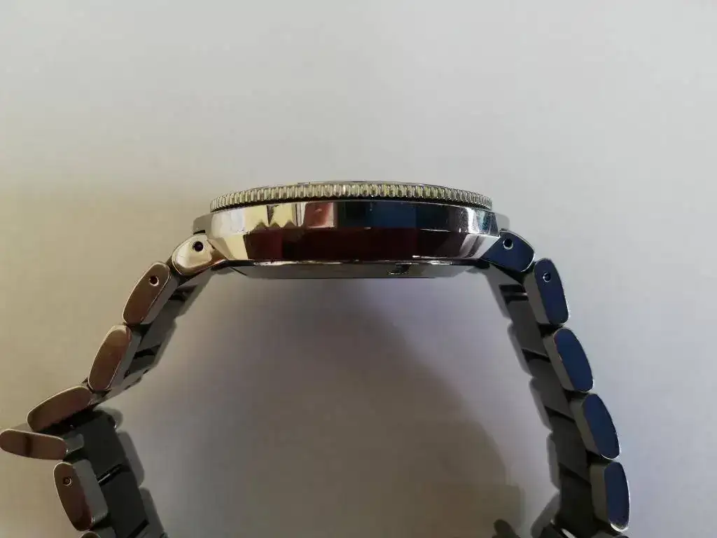 [FONT=Verdana, Tahoma, Helvetica, Arial]Quiero advertir que en la parte trasera si tiene un arañazo más profundo. A mi ya me llegó así, pero como puesto no se nota, decidí no darle más importancia. También decir que uno de los pasadores que unen los eslabones está doblado. Esto si fui yo, por meterme a relojero con herramientas made in China [/FONT]