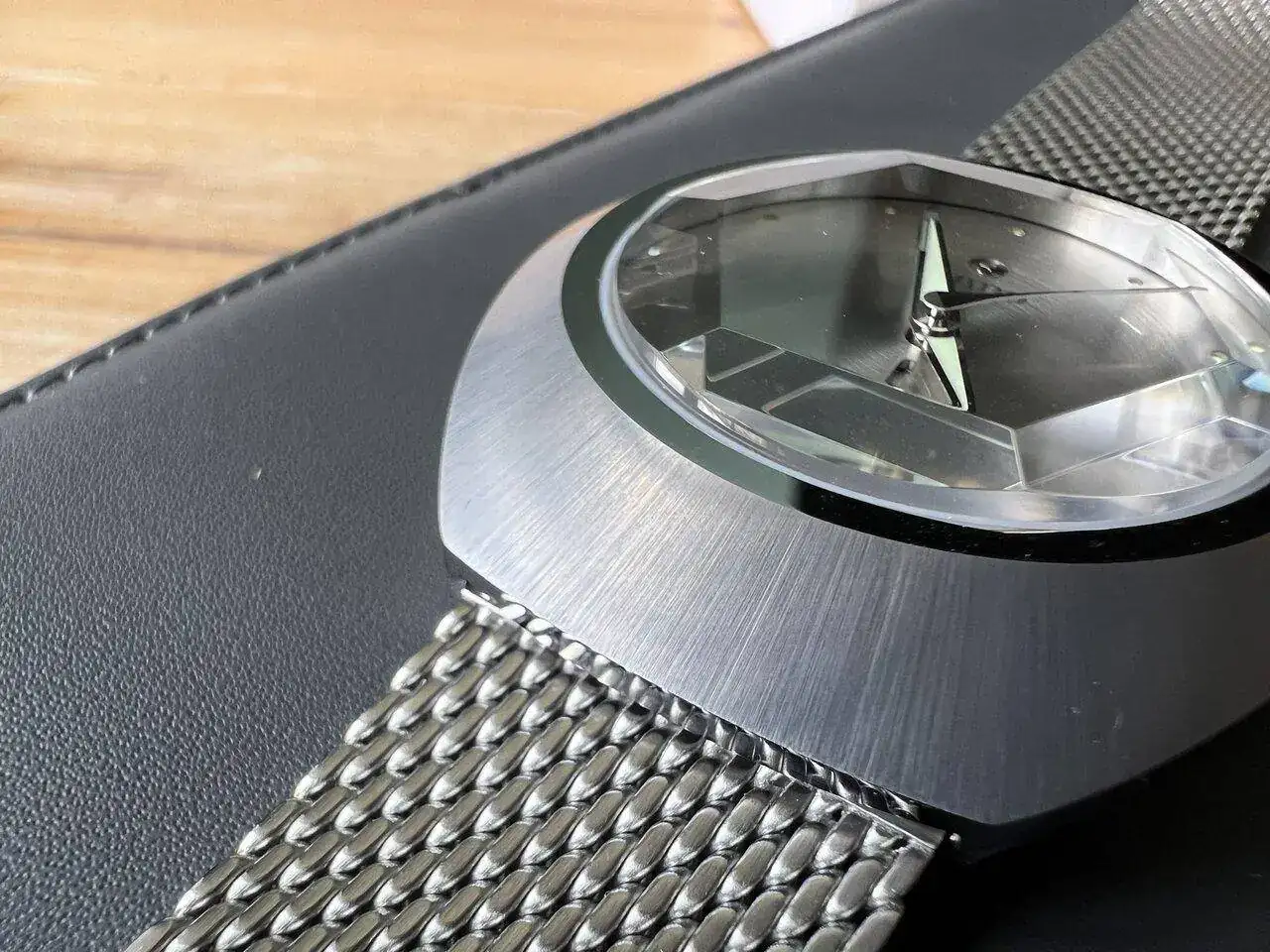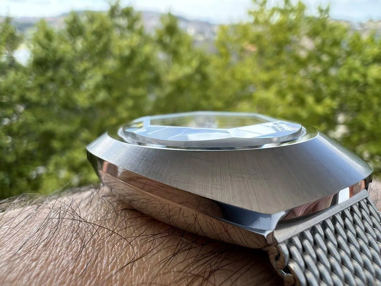 Como antes decía, como rasgos distintivos de otros rado de la familia están el acabado mate cepillado…, y el cristal de zafiro facetado hexagonalmente, para conmemorar el aniversario.