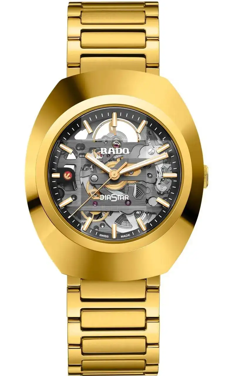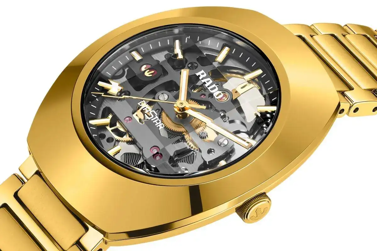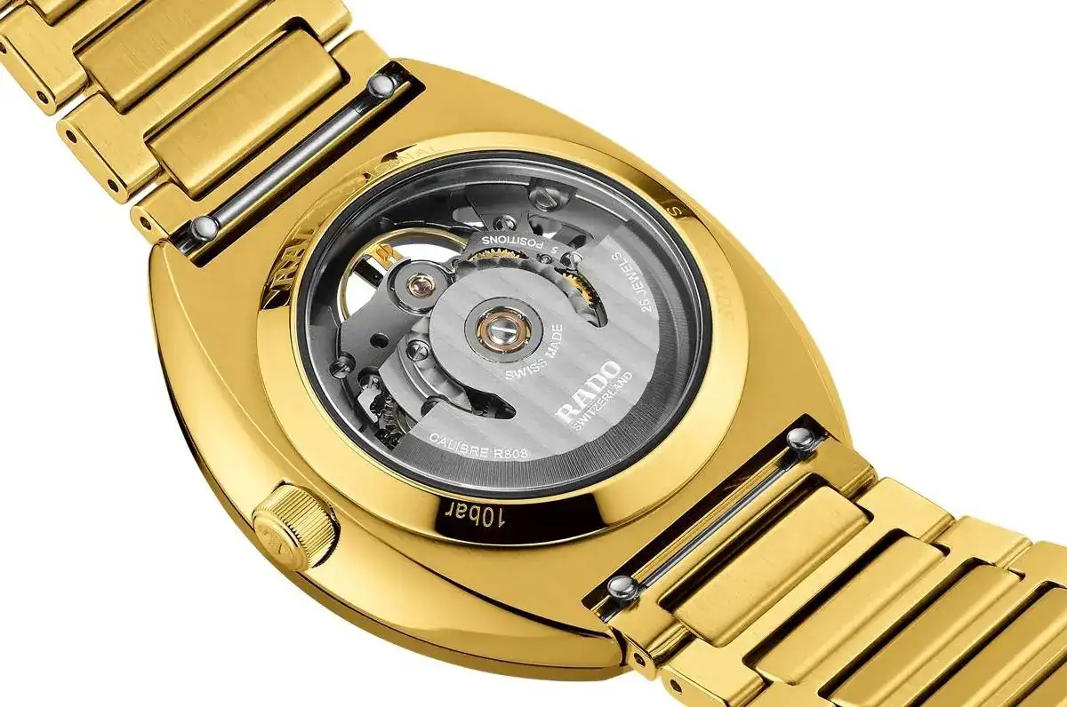 Y es con este nuevo material (sólo en el bisel, ojo) que Rado ha lanzado la enésima versión de su bestseller. Ahora dorado (como la edición lanzada en 1972) y con una esfera anular, lo que permite ver su calibre R808 (probablemente basado en el Powermatic 80) esqueletizado y que se puede ver también a través de su fondo transparente. La masa oscilante ha sido recortada para darle una forma parecida al ancla, el logo de Rado. Tanto la caja como el brazalete son de acero con tratamiento PVD. El cristal sigue siendo de zafiro, eso sí.