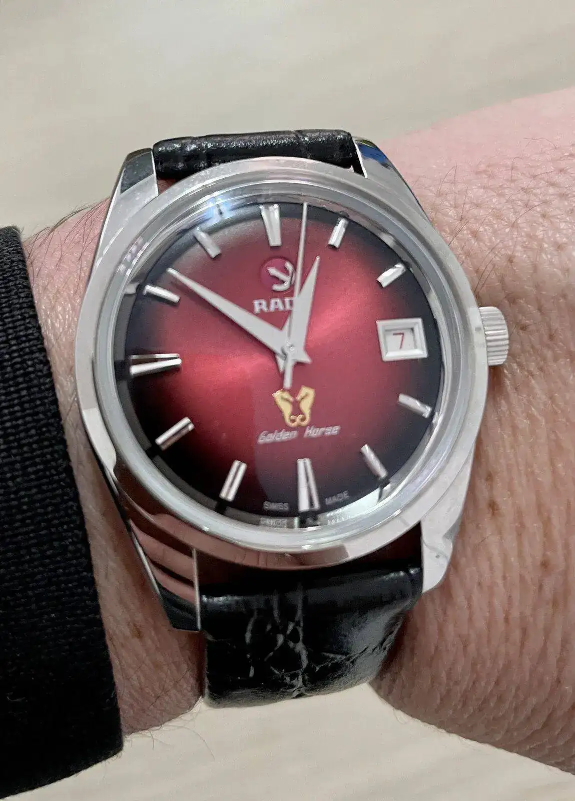 Rado nació en 1917 como el taller de relojería Schlup & Co. de Lengnau dirigido por tres hermanos. Tras expandirse desde sus humildes comienzos para convertirse en un importante proveedor de movimientos de relojes durante la Segunda Guerra Mundial, Schlup & Co. comenzó a vender relojes con la marca Rado a fines de la década de 1950. En 1957, cuarenta años después de su fundación, la colección Golden Horse hizo su debut como un modelo elegante pero resistente al agua y apareció con una variedad de funciones, esferas de colores llamativos y cajas de acero o chapadas en oro.