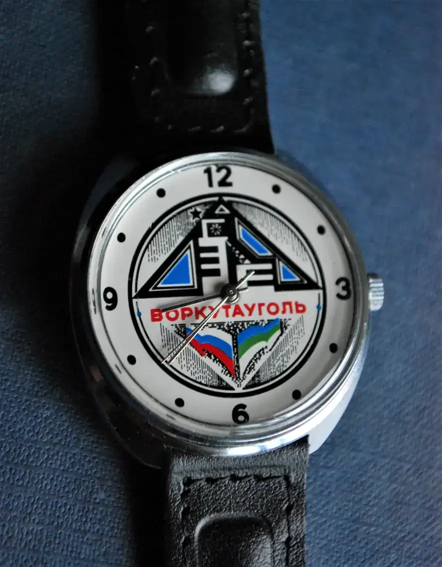 Raketa Vorkuta, caja 511XXX, movimiento 2609-HA con 19 joyas. Representa una factoria de carbón.