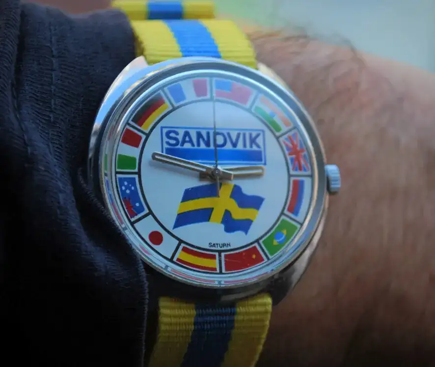 Reloj fabricado por Raketa , con caja 511XXX, con marca SATURN, para la corporación sueca SANDVIK, es posterior a 1.991 ya que se observa la bandera de Rusia. El movimiento es el 2609-HA con 19 joyas.