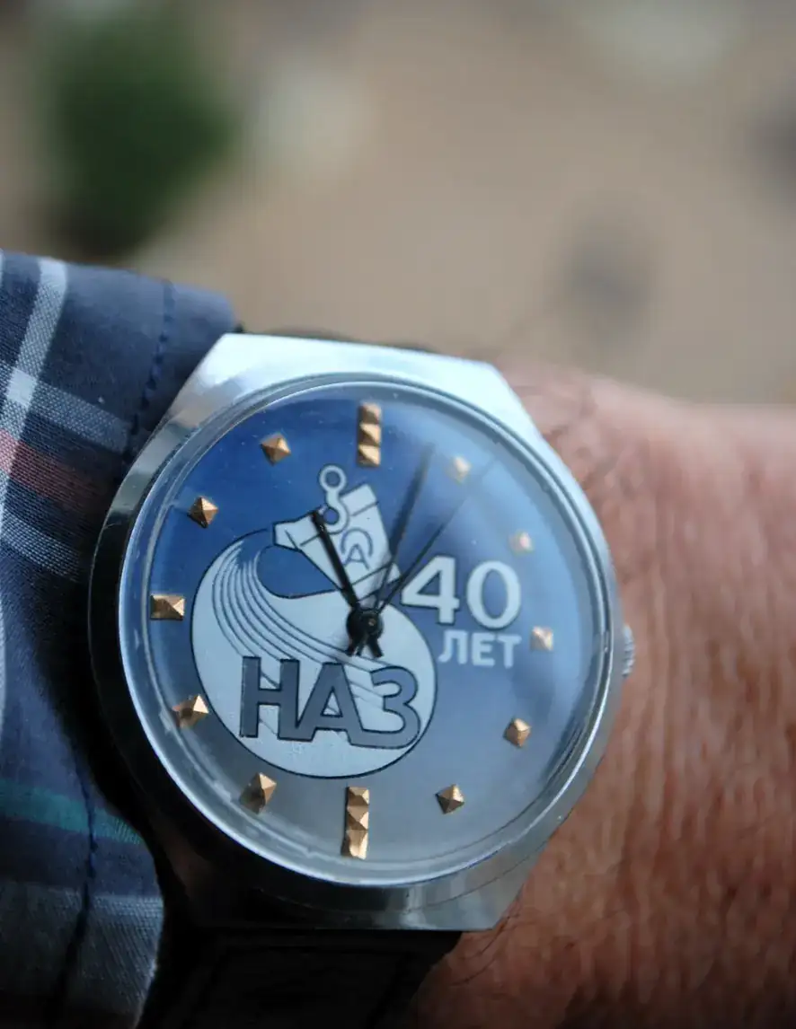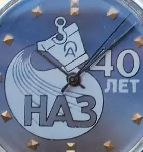 Reloj Raketa con movimiento 2609-HA de 19 joyas, montado en caja 841XXX, conmemora los 40 años del establecimiento de la planta de refinado -afinado en Novosibirsk, Planta denominada Afinaz, en ruso (АО «НАЗ»)