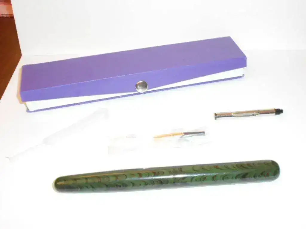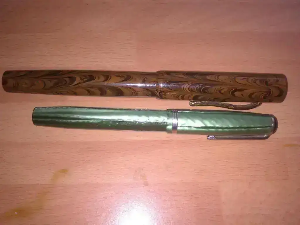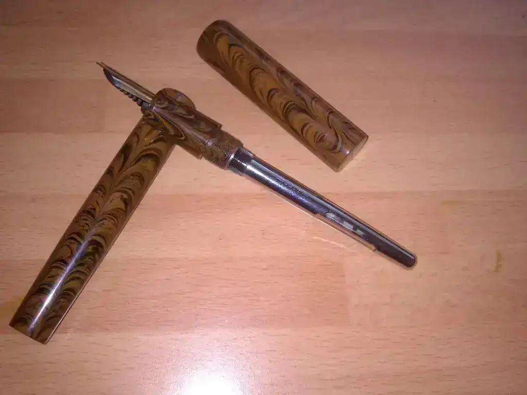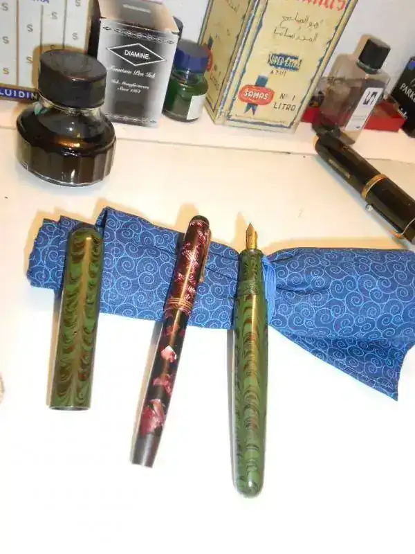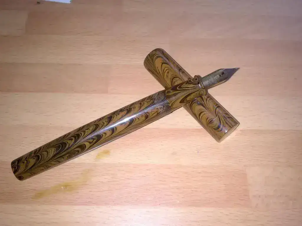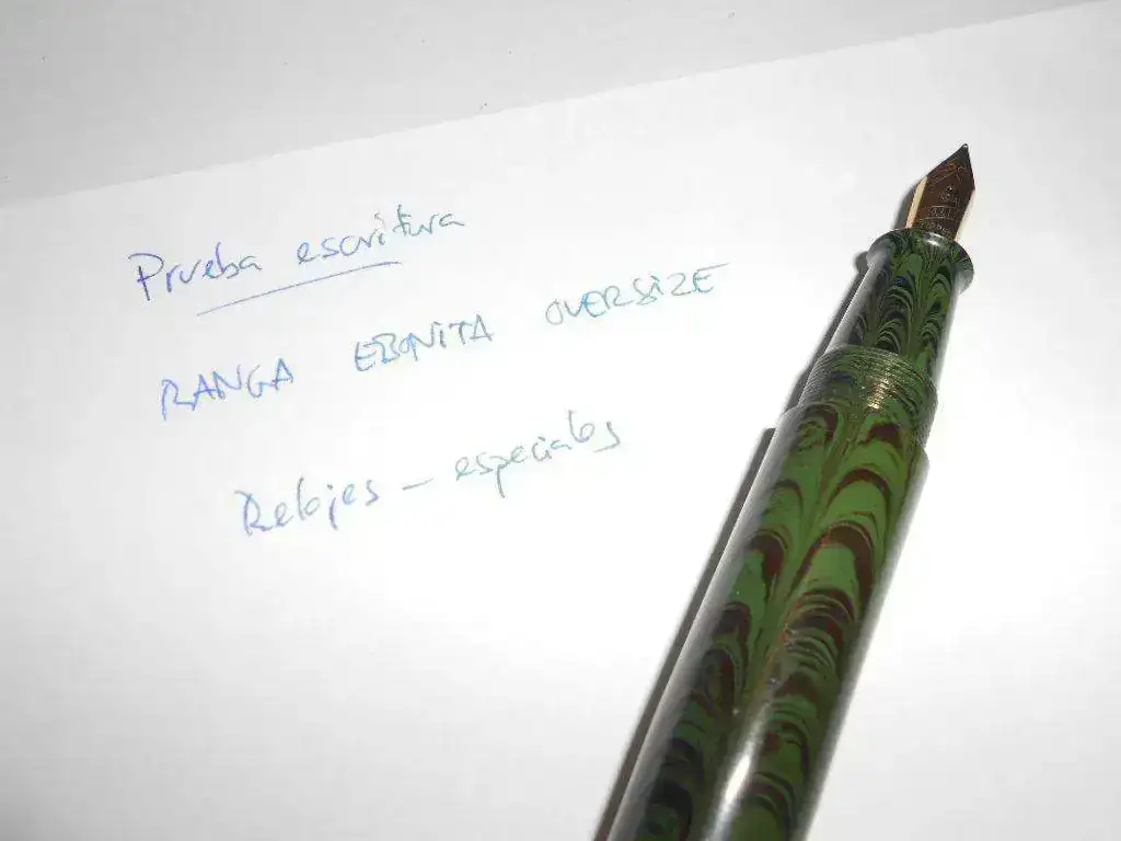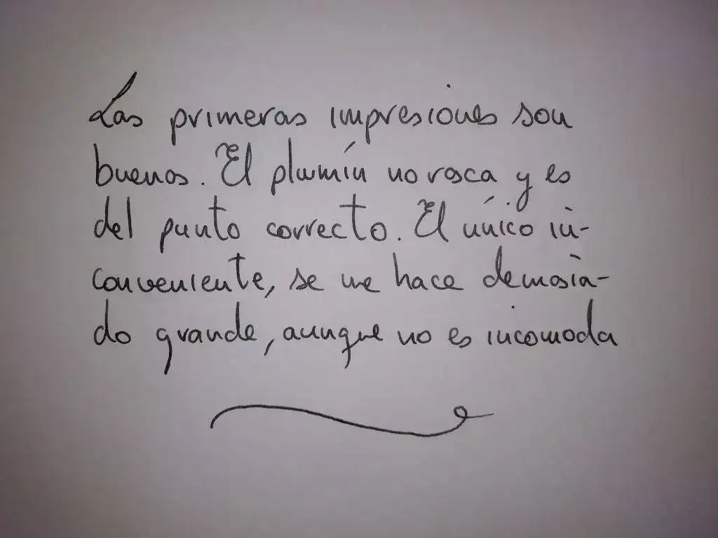 La pluma, a mi parecer, es preciosa. El acabado es bastante bueno y la estilográfica tiene el inconfundible olor a ebonita. El plumín, en contra de lo que había leído por ahí, escribe bastante bien y en un punto que se me hace habitual, aunque obviamente no es el de una Montblanc. En cuanto al sistema de carga, aunque un eyedropper hubiese resultado más "auténtico", me decanté al final por un sistema aerométrico que funciona correctamente. El único incoveniente que le veo a la pluma es que me resulta un poco grande acostumbrado a la Parker 21 o a la Esterbrook, aunque no se me hace para nada incómoda.