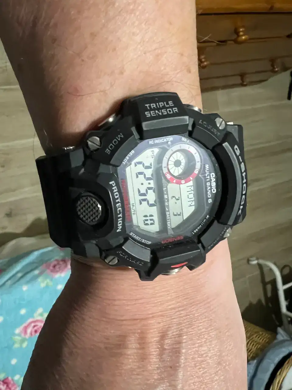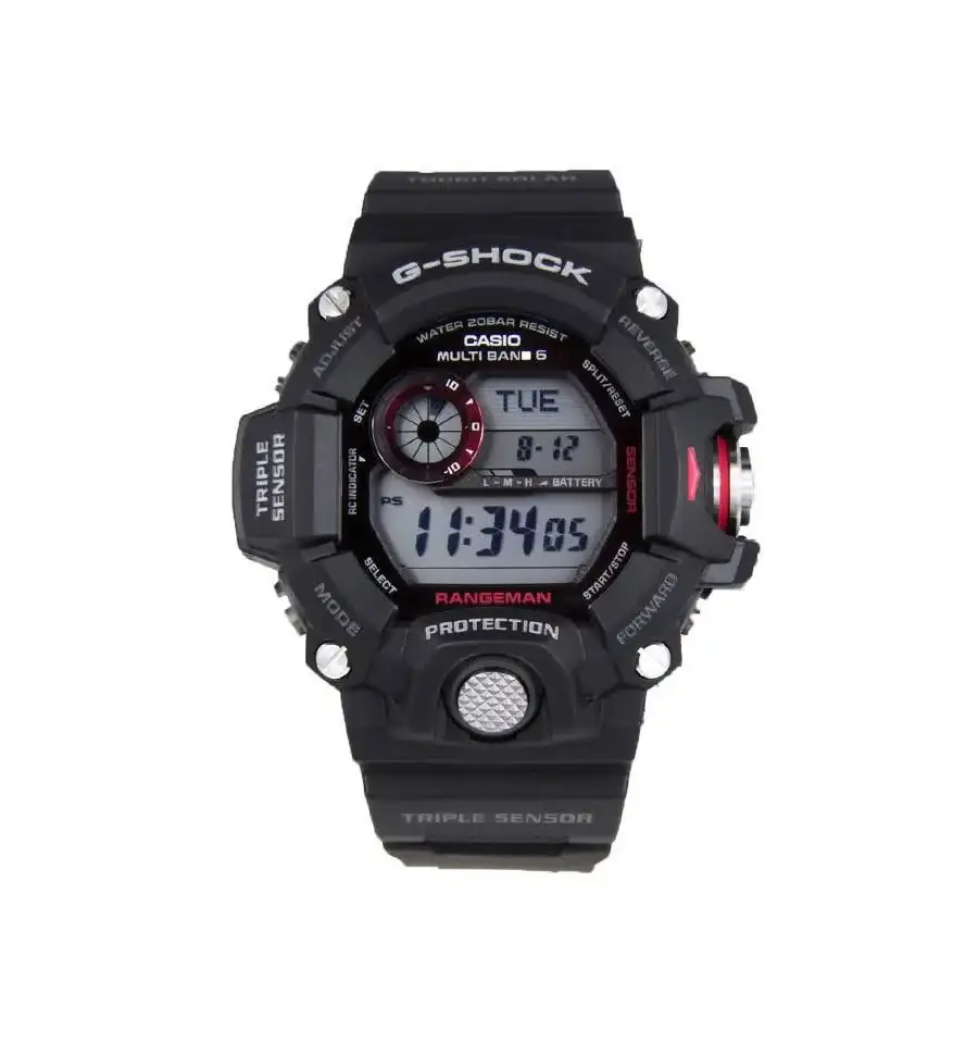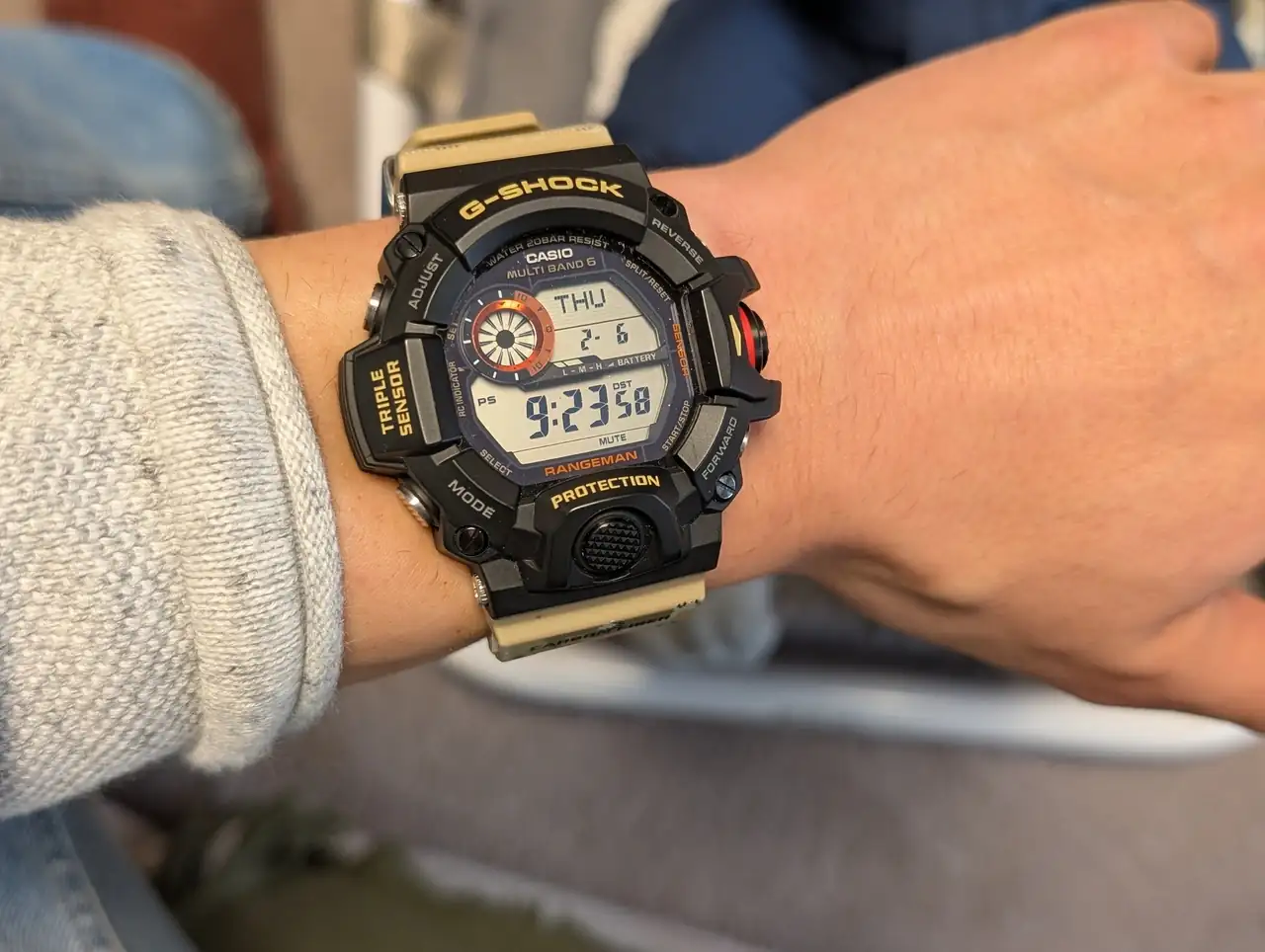 El Rangeman GW-9400 es un G-Shock muy cómodo para el tamaño que tiene, hasta sorprende lo cómodo que es. Y yo no lo veo tan grande, teniendo en cuenta sus medidas, que sobre el papel pueden asustar. Hay que ver qué tipo de reloj es, como pasa con los diver, que toleran tamaños mayores que los relojes de vestir. Gran parte del Range es bisel, lo que hay alrededor de la pantalla, que es masivo y anguloso, pero que hace que al ser la pantalla de un tamaño contenido en relación con el tamaño total del reloj, no se vea tan grande como podría parecer. A veces me veo un poco más grande mi GD-350, porque tiene la pantalla un poco más grande. Igual que con los diver, que el bisel se come parte el tamaño, y al quedar una esfera más pequeña que en un reloj de vestir del mismo tamaño, no parecen tan grandes. Además, con un reloj tan deportivo y con una connotaciones de resistencia extra y trabajo duro, cambias el chip, y hasta gusta que se vea más grande y brutote.