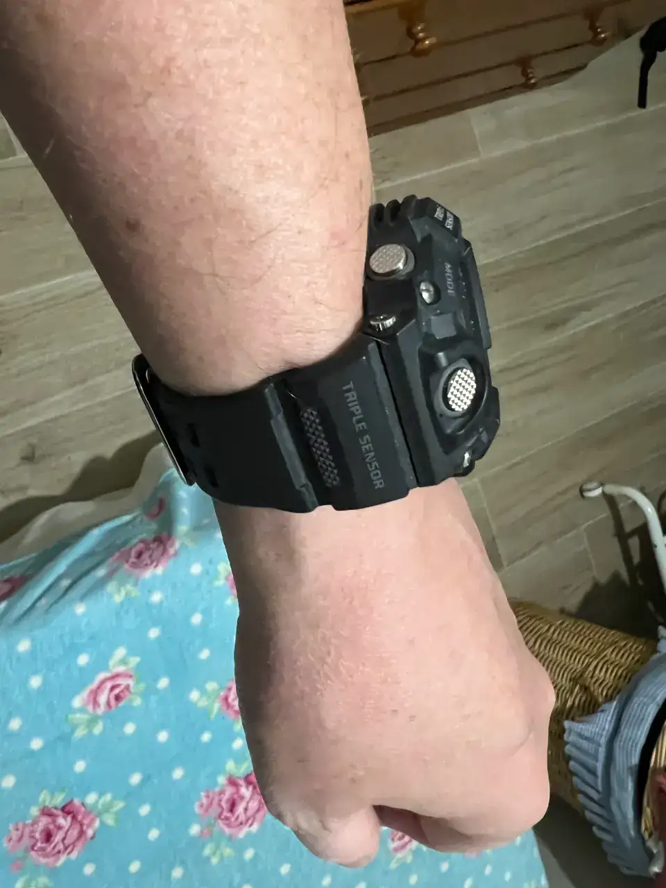 En esta foto siguiente se ve que la caja del Rangeman es más alta, y eso se nota en las mangas si las llevas ajustadas. Pero con ropa no muy formal va bien. De todas formas, en esta foto el tamaño del Pro-Trek está minimizado por estar más lejos de la cámara, por el ángulo de la foto. Algunas fotos engañan bastante, son relojes muy parecidos de tamaño, salvo en la altura de la caja, que en el Rangeman sí es claramente mayor. También tiene mucho más protegido el módulo, es un G-Shock.