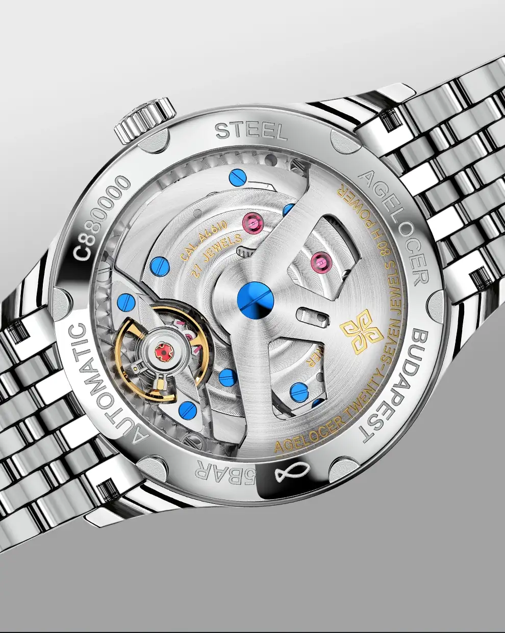 "The Agelocer caliber A4610 is an automatic watch movement with 27 jewels. This caliber appears to be based on the Hangzhou caliber 7200A framework with a similar balance bridge structure. It also uses a Magic Lever style pawl lever system for bi-directional winding.