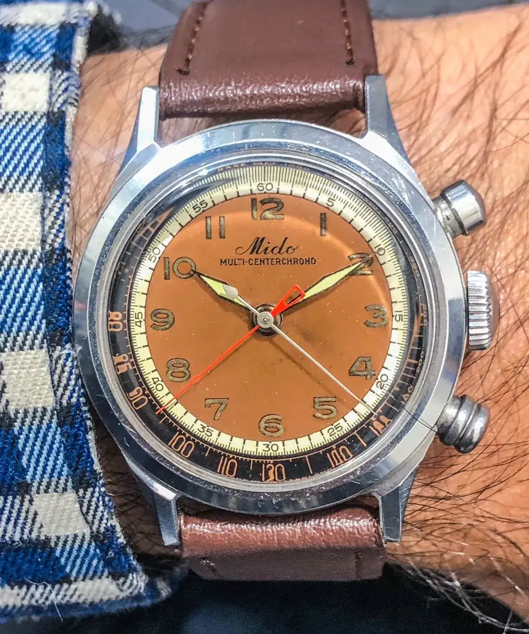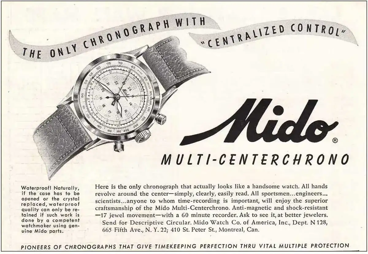 Hoy les presento un reloj poco común por estos lares, se trata de un Mido Multi-Centerchrono, el cual a primera vista y por su esfera parece un reloj normal y corriente pero al contar con los típicos pulsadores de cronógrafo ya se intuye que es otra cosa distinta. El Multi-Center se diseñó en los 40s del siglo pasado rompiendo totalmente el esquema de los cronógrafos estándar que cuentan con subesferas para controlar los minutos u horas que pasan. Como decía el anuncio original de Mido: "Aquí está el único cronógrafo que parece un reloj elegante". Todos los registros son colineales con el piñón central, gracias a un calibre Valjoux VZ modificado (son movimientos increíbles) que llegó como calibre 1300 de Mido. La manecilla de acero registra los segundos del cronógrafo, mientras la roja lleva la cuenta de los minutos transcurridos. Este diseñó es tan limpio que uno se pregunta por qué no tuvo éxito y otros marcas no sacaron algo parecido.