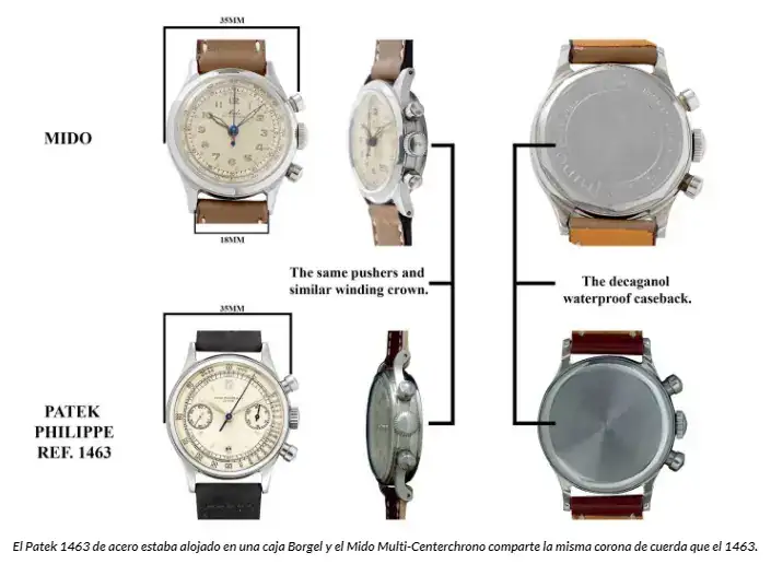 El Patek 1463 de acero estaba, de hecho, alojado en una caja Borgel y el Mido Multi-Centerchrono comparte la misma corona de cuerda que el 1463. De hecho, toda la caja del Mido es similar a la del Patek 1463.