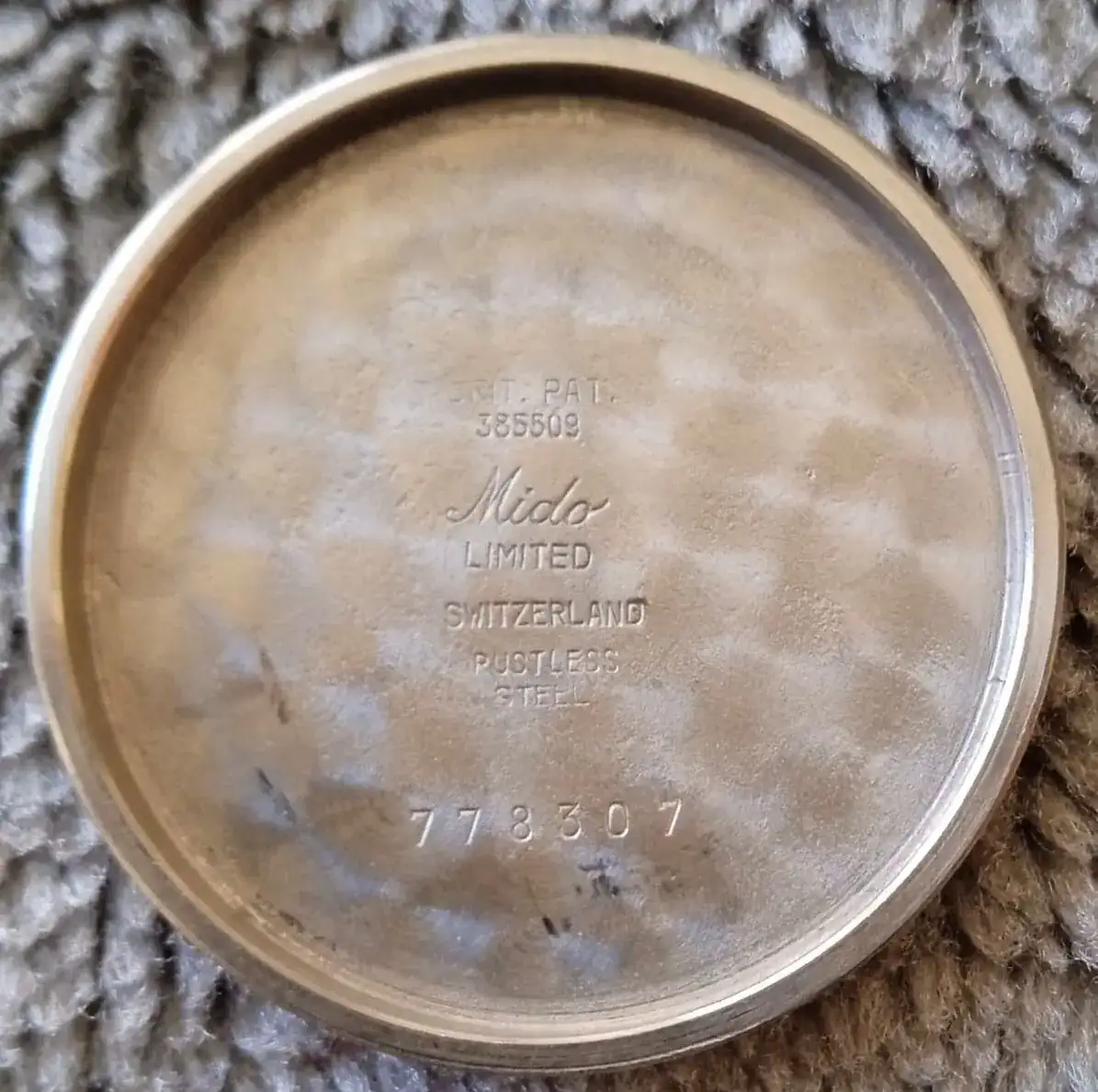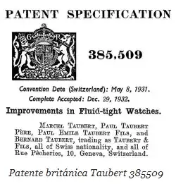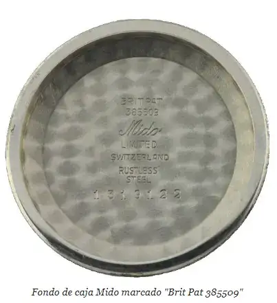Los fondos de caja de los Mido no llevaban la marca registrada Borgel FB-key que utilizaban los Taubert en aquella época. Llevaban el sello "BRIT PAT 385509". La patente británica 385509 (de la que se muestra un extracto más adelante) era la versión británica de la patente suiza de la caja Decagonal impermeable de Taubert y es una prueba de su origen. Es de suponer que, como muchos otros fabricantes, Mido no quisiera revelar que las cajas no eran de su propia fabricación. Tal vez porque fueron de los primeros en adoptar la caja Decagonal, o tal vez como contrapartida por organizar las pruebas de Nueva York, pudieron arrancarle esta concesión a Taubert, que normalmente insistía en sellar todas las cajas con la marca FB-key, como las suministradas a Movado y West End.