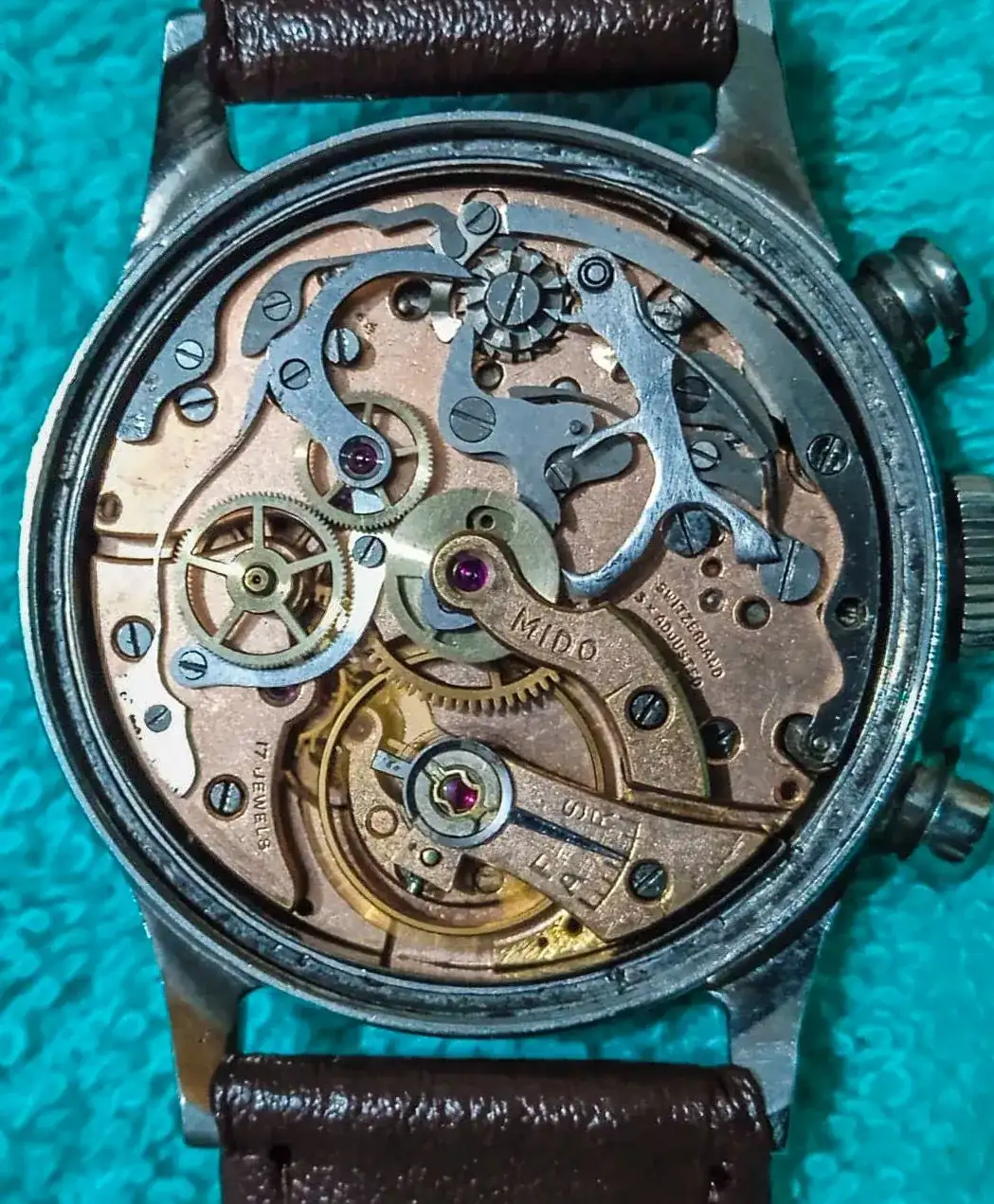 Calibre Valjoux VZ 1300 de cuerda manual modificado por MIDO tiene horas, minutos además del cronógrafo con aguja para minutos y segundos: