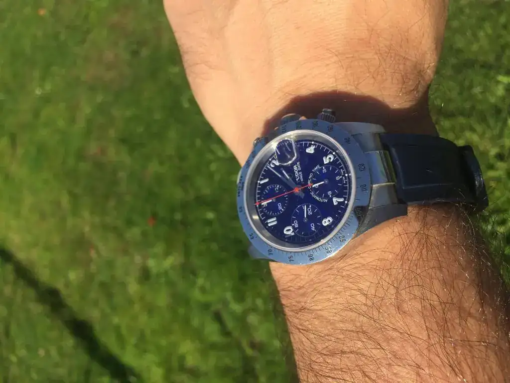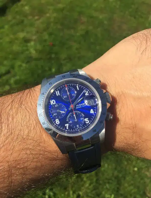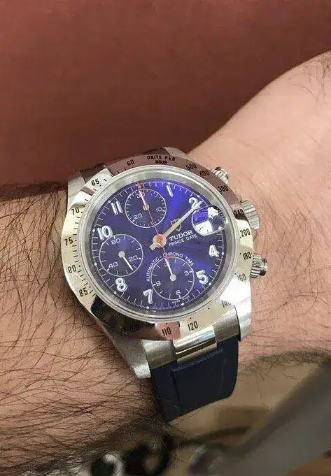 Saco para venta este precio y raro Tudor Prince Date Chrono 79280 con una esfera azul preciosa. Viene con su caucho azul y su deployante de acero.