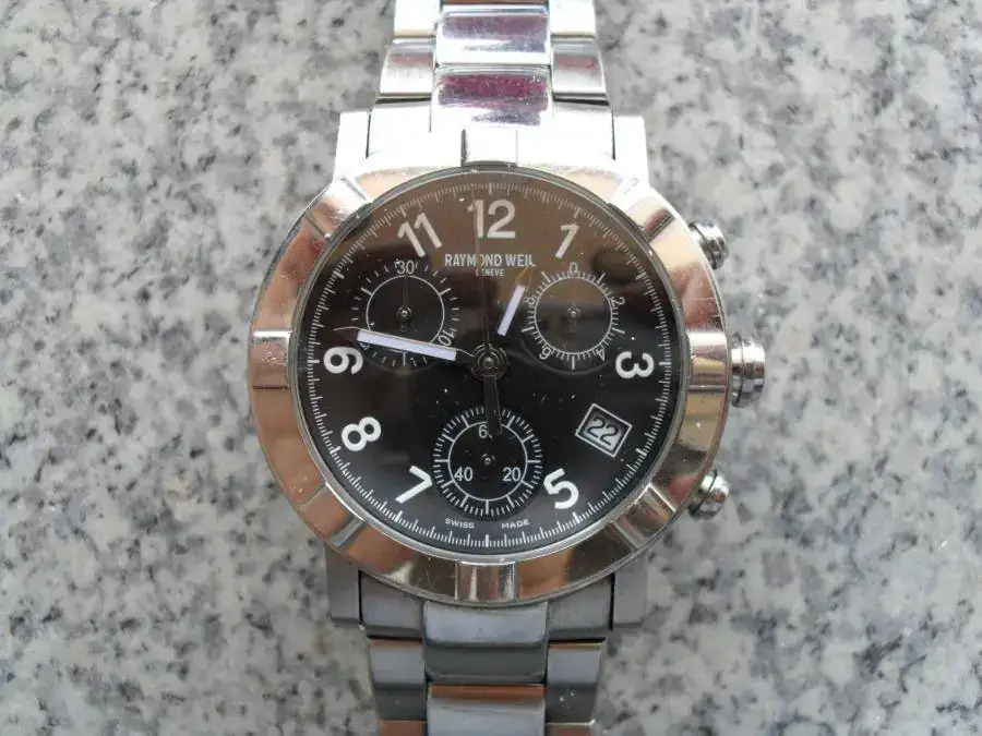 Pongo a la venta un deportivo y a la vez elegante Raymond Weil 5030. El reloj está en buen estado, aunque tiene algunos detalles a señalar: típicos roces en tapa trasera y armis, así como en el bisel de acero, nada que no arregle un buen pulido.