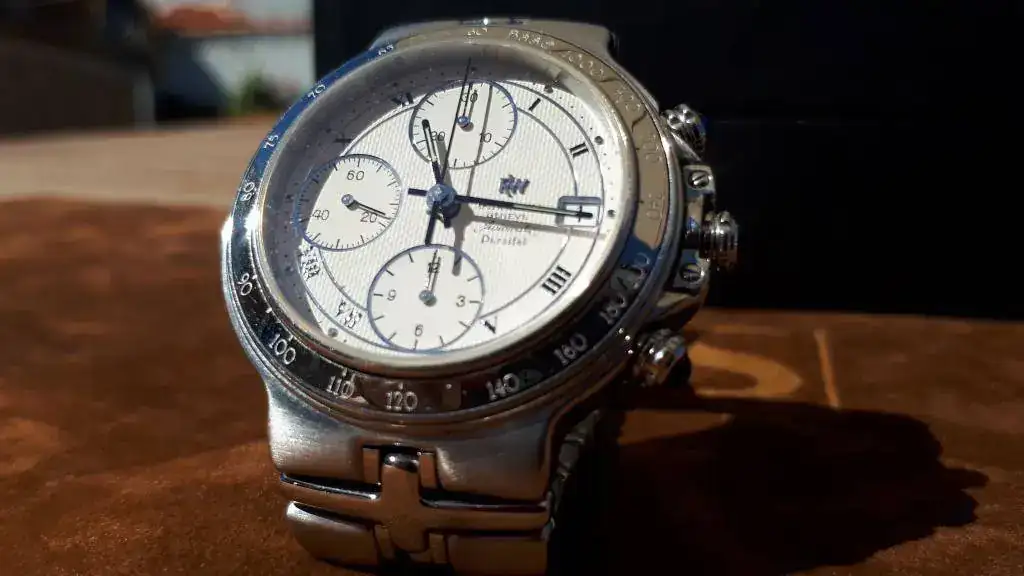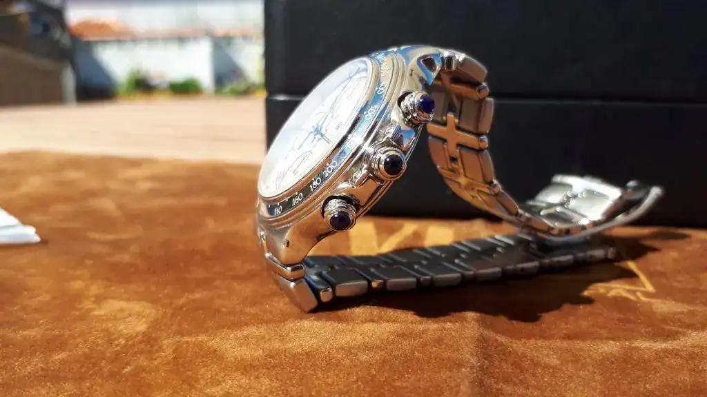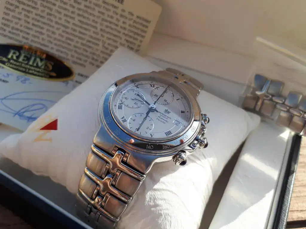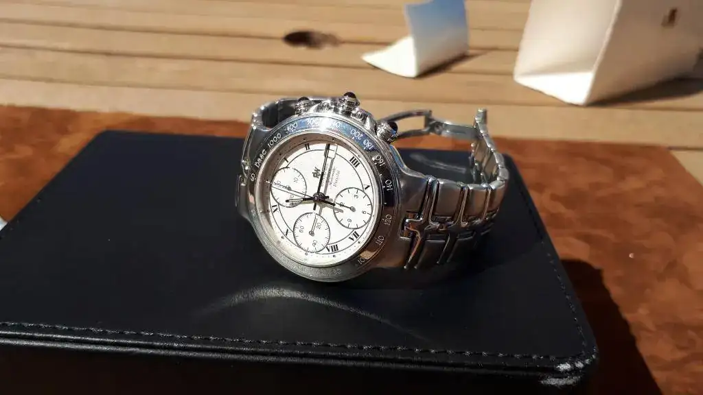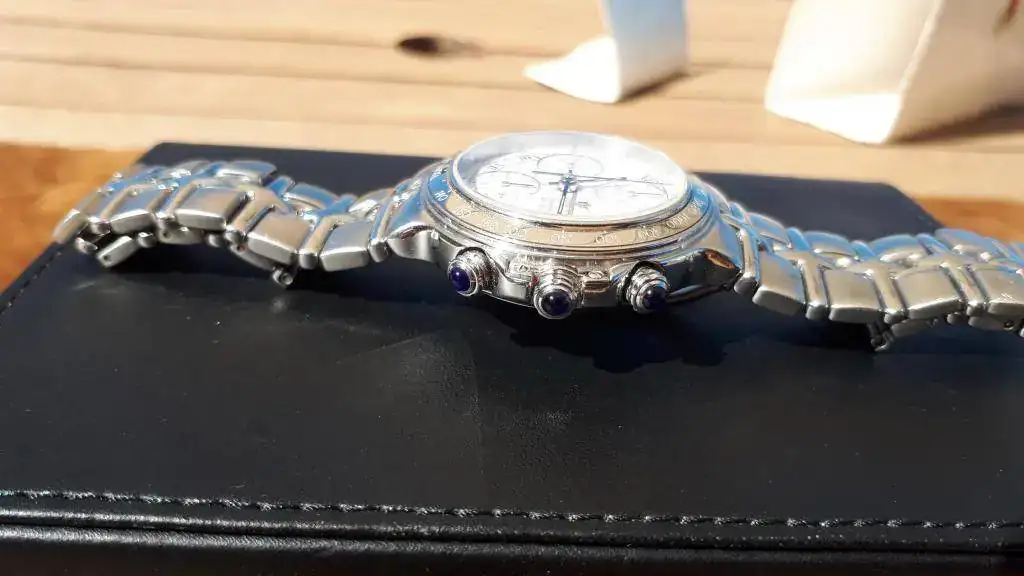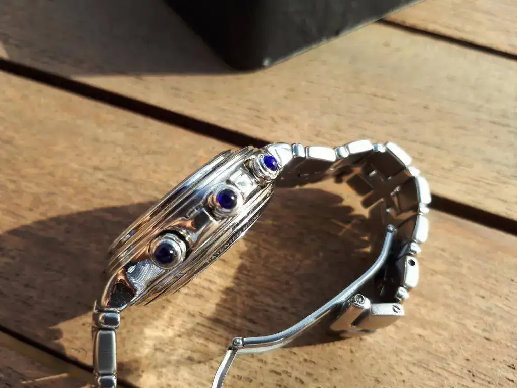 El estado de marcha es muy bueno,...este año va a cumplir los 20... la esfera es de un color crema, ...texturizada. El crono va perfecto, y el cambio de fecha es rápido. Estéticamente es de destacar los tres zafiros de los pulsadores, y el tamaño, justo a mi entender, 39mm sin pulsadores, para a los que no les gusta ni el tamaño desmesurado...