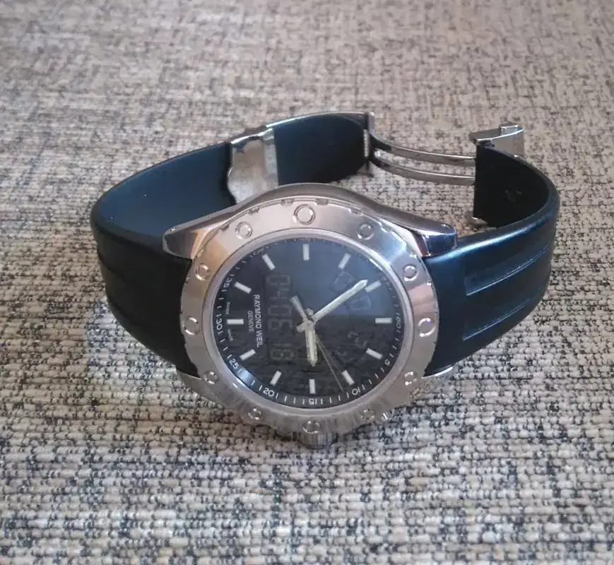 Saco a la venta este excelente Raymond Weil, modelo RW Sport 8400-ST-20001 Ana-Digi, con varias funciones, entre ellas: Doble horario, calendario completo con número de semana, chrono, cuenta atrás, alarma, alarma anual (agenda), luz.