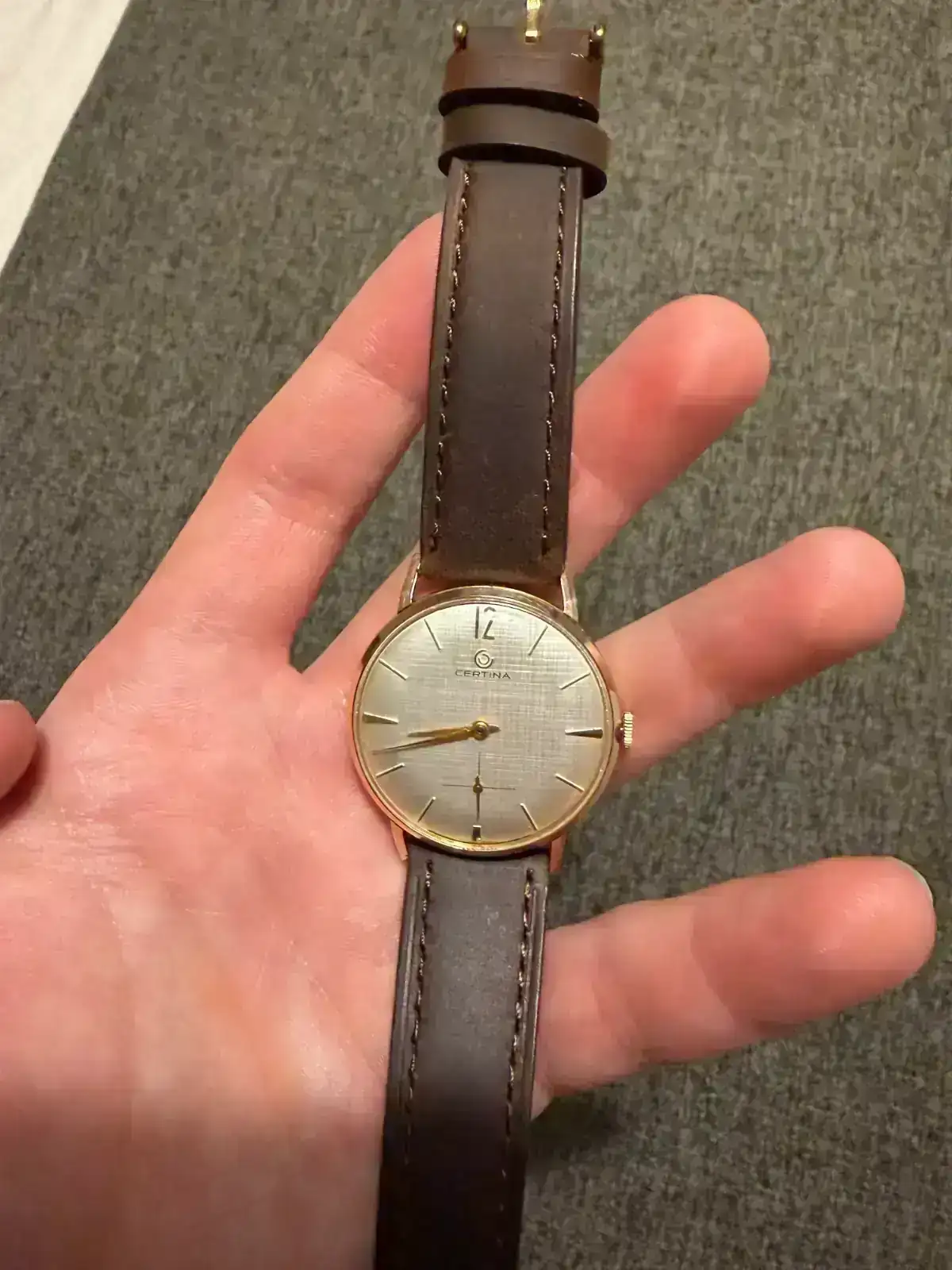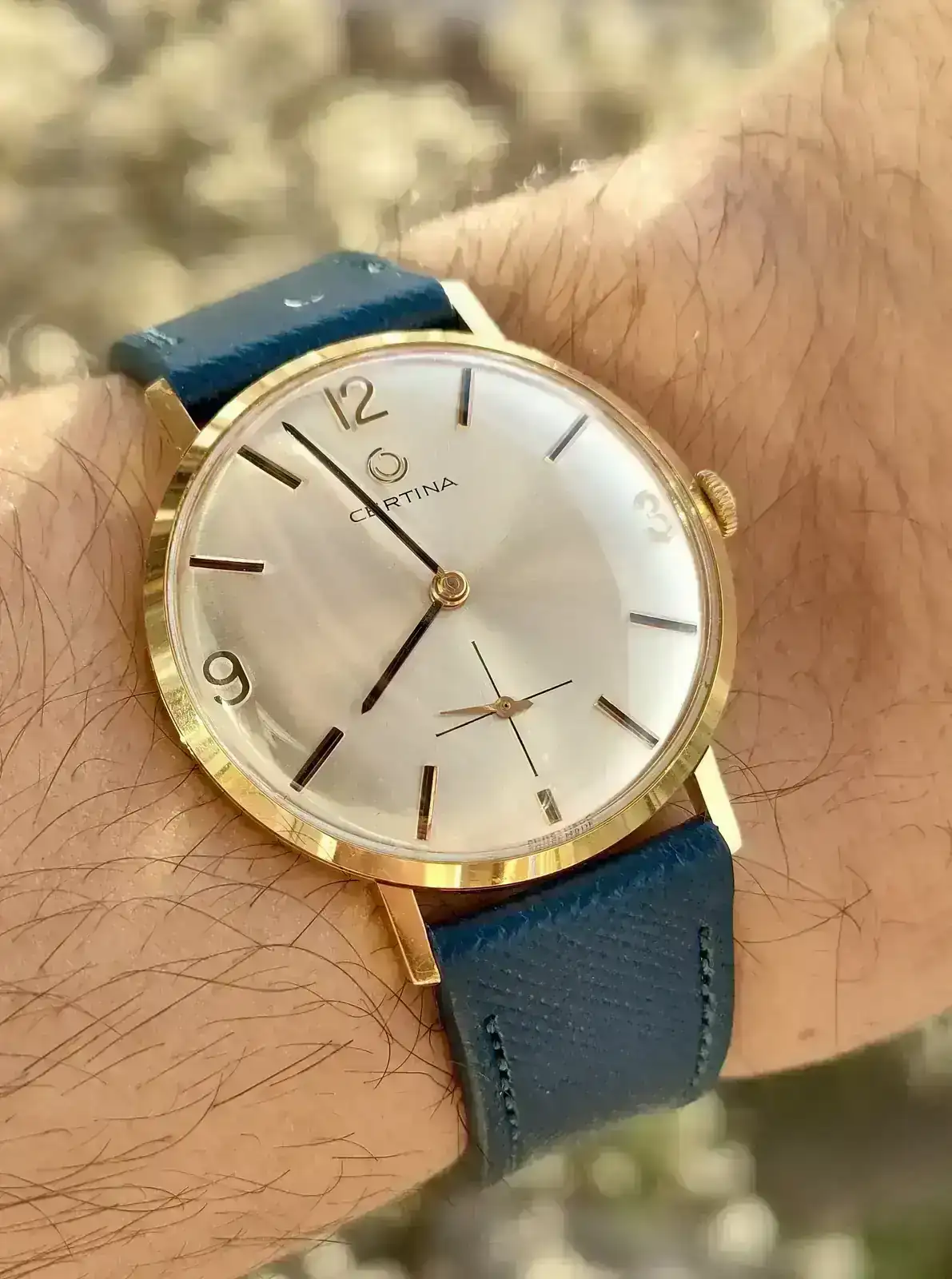 Desde hace tiempo tenía claro que quería que mi primer vintage fuese un Certina de vestir y tras una larga búsqueda encontré este, que me encantó desde el principio y se encontraba en muy buen estado. 34mm , chapado en oro 20 micras, esfera tipo lino… ya cuando me llegó me encantó. Se lo llevé a mi relojero, que le limpió el movimiento ( a pesar de tener 61 años, el reloj funcionaba perfectamente) pulió la caja, que le devolvió al oro todo su brillo, y le cambió el plexi, dejando el reloj completamente nuevo.