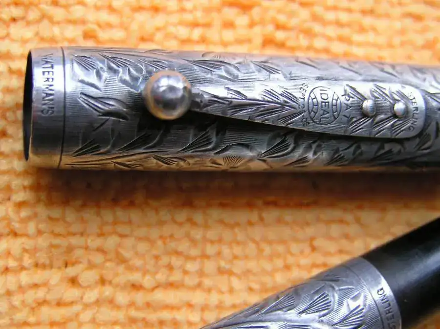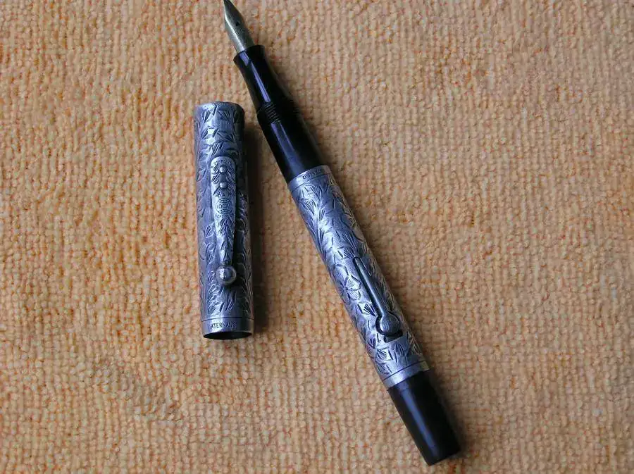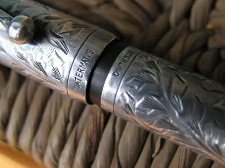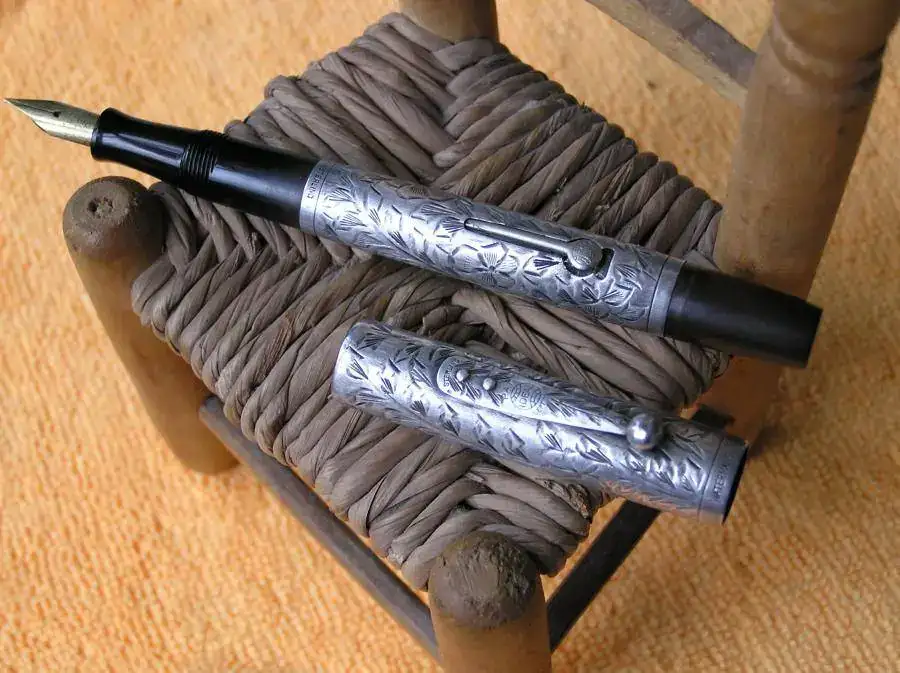Es una Waterman 452 de plata, digamos que sobre el año 1927, profusamente grabada a mano con motivos de hojas y ramas, "hand engraved vine"