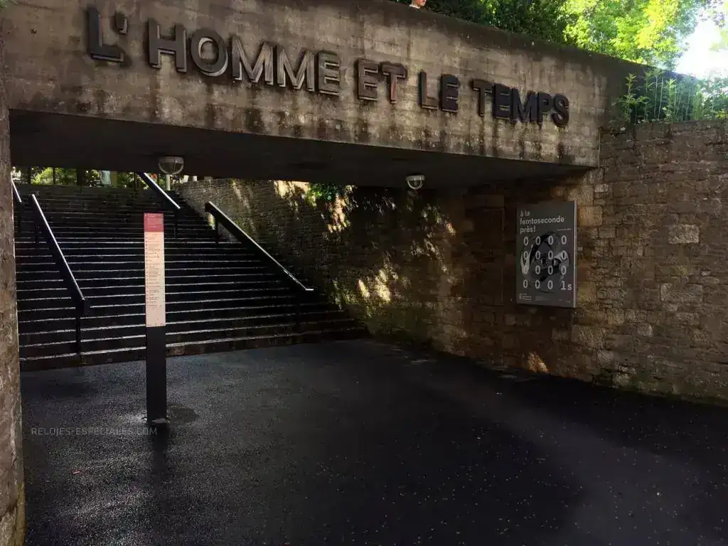 El caso es que llegamos al Museo Internacional de Relojería (Horlogerie), alojado en un edificio que recordaba -imagino que no sin intención- al genial arquitecto. Todo de hormigón, se inserta en la loma y queda prácticamente bajo tierra. Por cierto, ese cartel de la derecha habla de una próxima exposición temporal dedicada al "