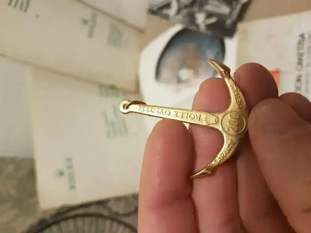 Una cajita Rolex antigua de carton, y dentro....un lacre, una etiqueta de un submariner con el precio en pesetas, y un ancla dorada 200m. El ancla estuve mirando info y he visto precios desorbitados, por lo que no se que pensar....habre encontrado un tesoro???[emoji1787][emoji1787][emoji1787]