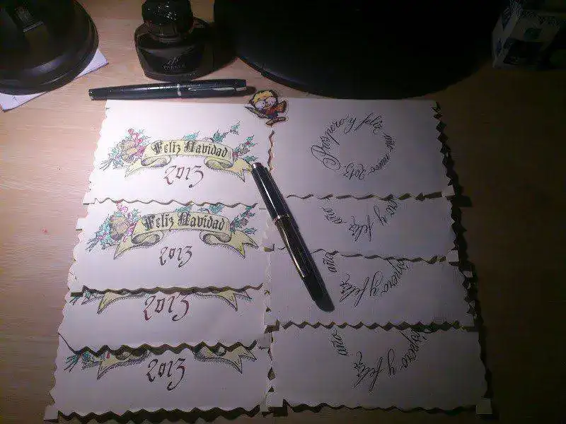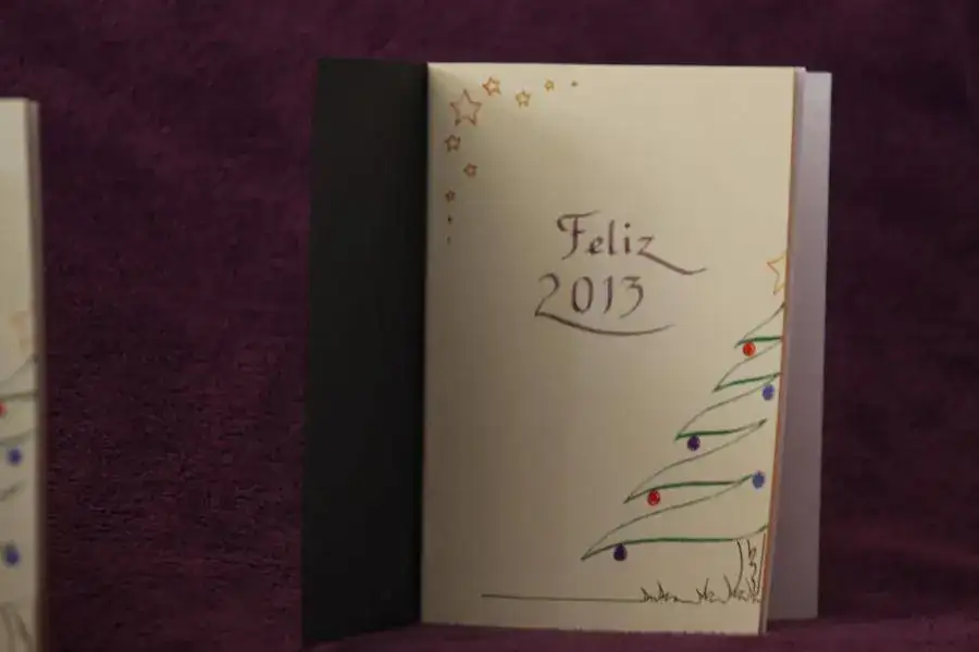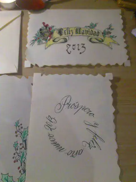 Cortaremos los bordes de los Christmas de forma ondulada, y caligrafiaremos la parte posterior con el mensaje "Prospero y feliz año nuevo 2013".