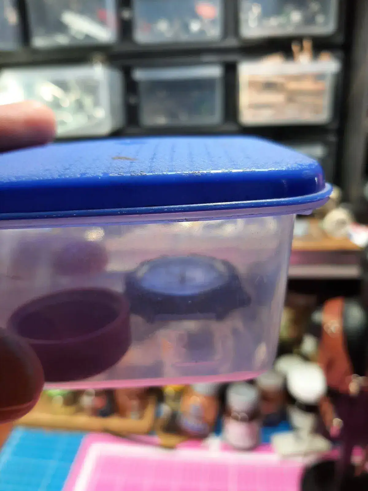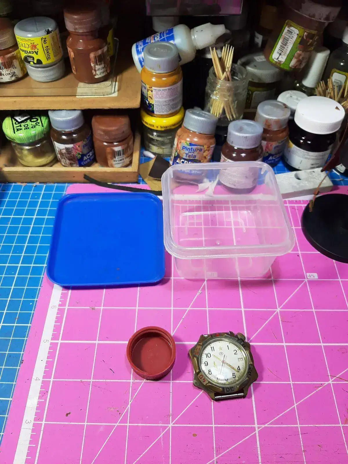 Estos son los elementos para forzar la patina, el recipiente con tapa, un recipiente pequeño para el amoniaco, en este caso una tapa plastica y el reloj, (no salen en la foto, el amoniaco y para dosificarlo uso una jeringa comprada en la farmacia, es ideal pues evita derrames y pleitos con la MDD por el olor del amoniaco ), el tuper lo compre con los chinos, para evitar la ira de mi mujer si tomaba uno de la cocina.
