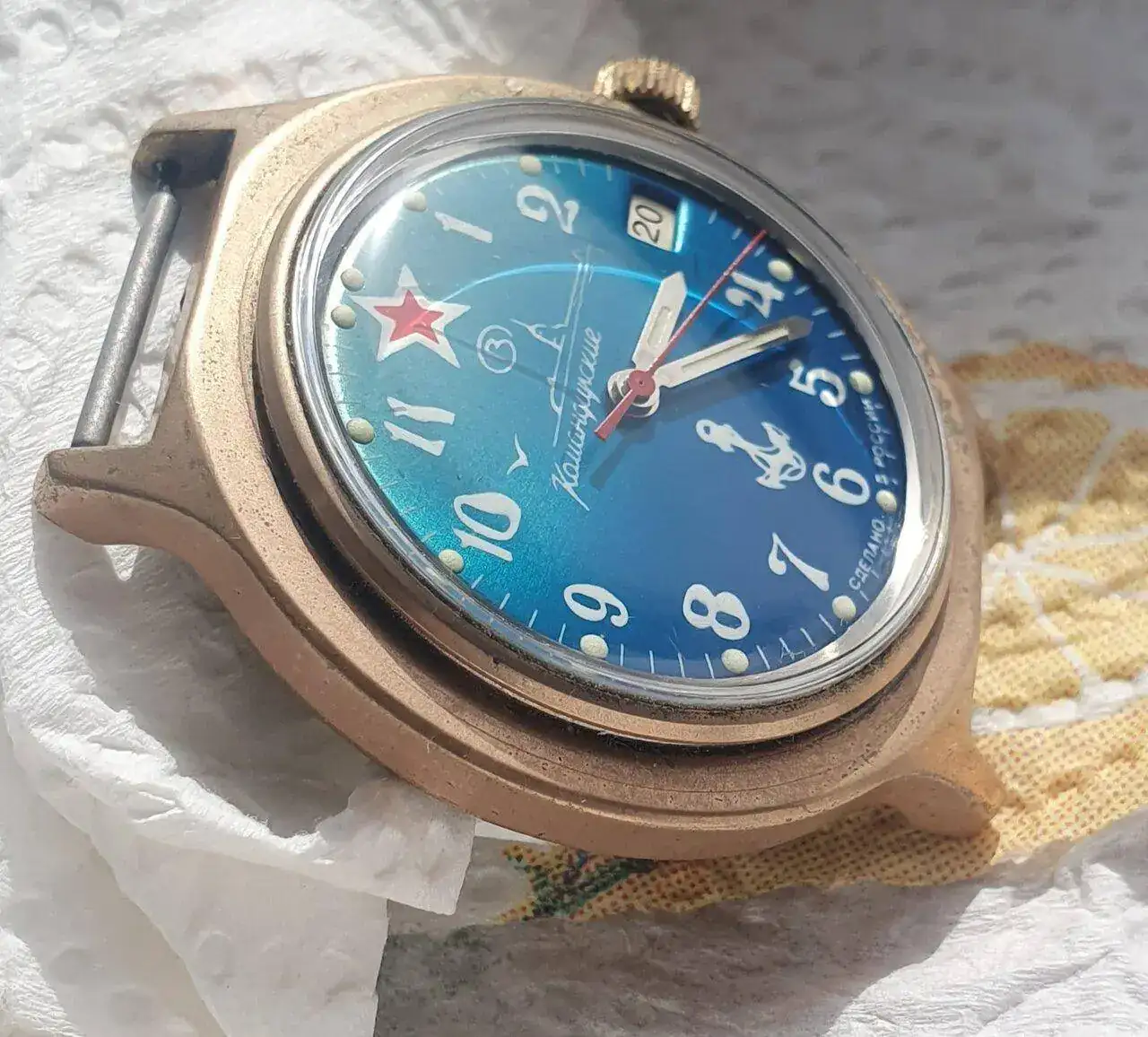 Yo compré un par de Komandirskies en la bahia y el cromado de los biseles, tuve que sacarlo con lija, pues el acido ni los despeinaba, me supongo que este cromado dorado, debe ser de esa epoca, las cajas si las puede brassear son problema, pero los biseles, no hubo manera.