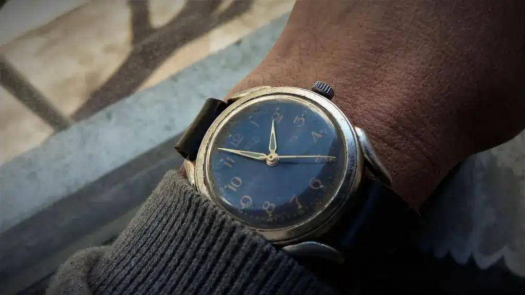 Como podemos ver se trata de un reloj estilo art decó, en este caso con segundero central, asas soldadas y agujas y puntos horarios luminiscentes, con radio. Una de sus principales particularidades, es su caja, que está fabricada en aluminio y creo que es el único caso que podemos encontrar dentro de la relojería soviética, de cajas construidas con este material, Si alguien conoce algún otro tipo por favor que me corrija. En esta foto con luz solar podemos apreciar mejor la caja y el color del aluminio. El Ural se dejó de fabricar a principios de la década de los 60 y la fábrica se renombró como Molnija.