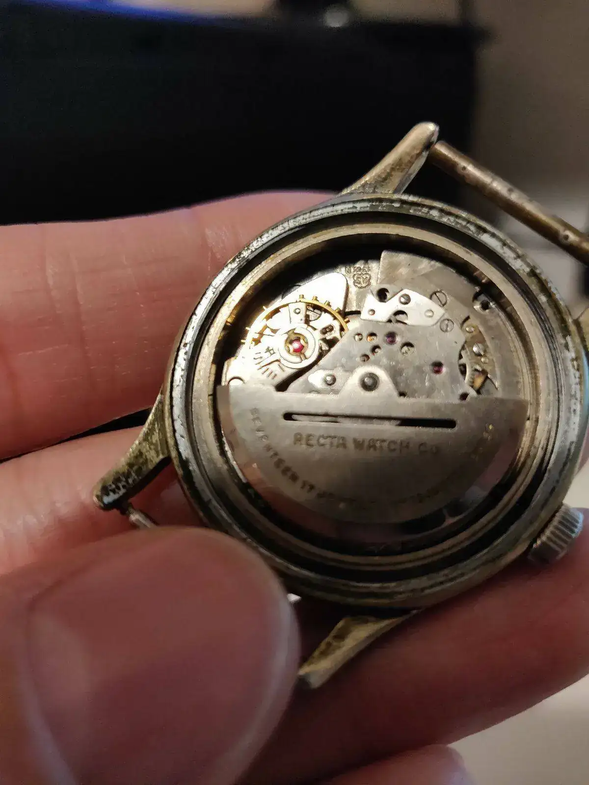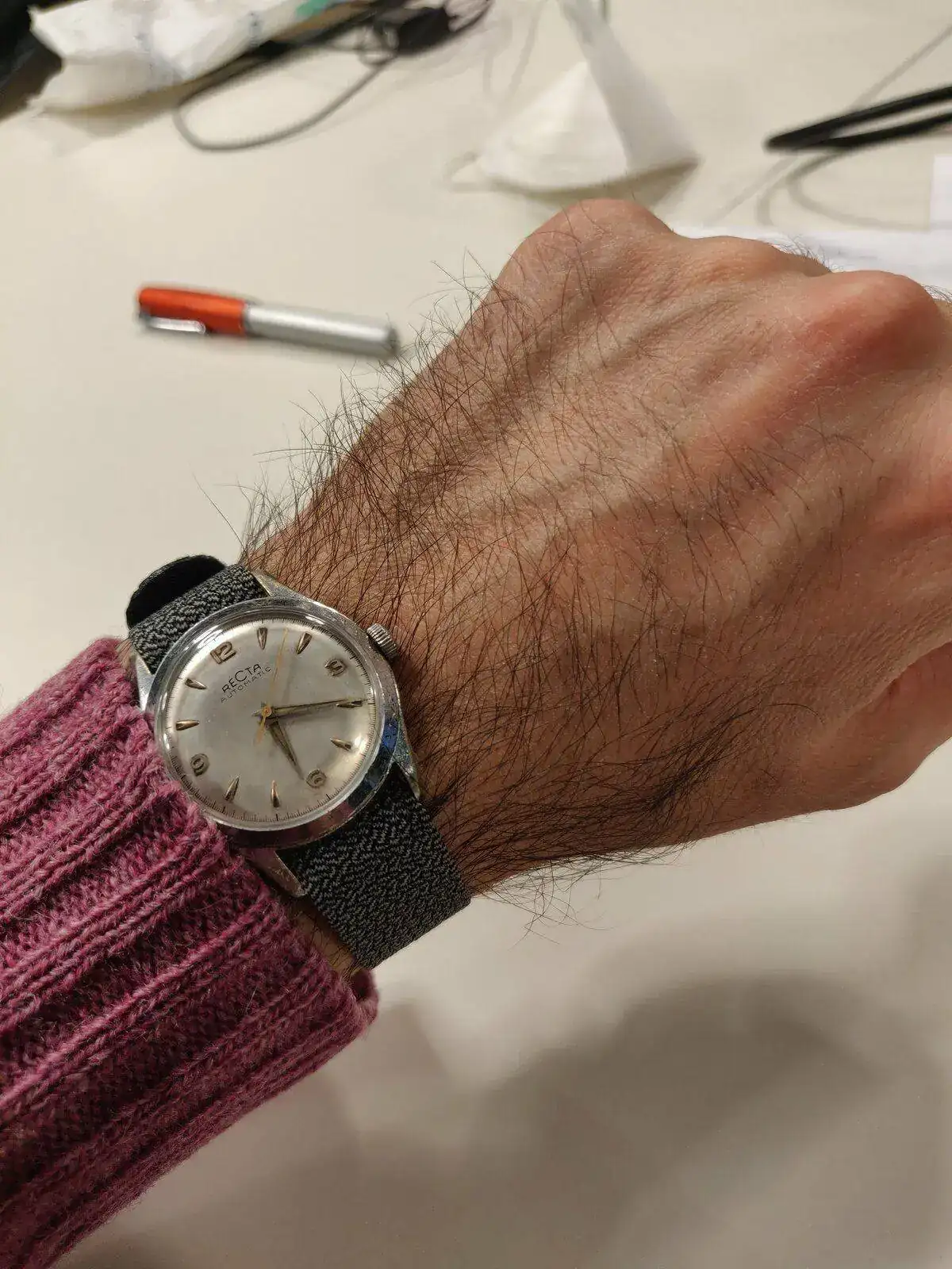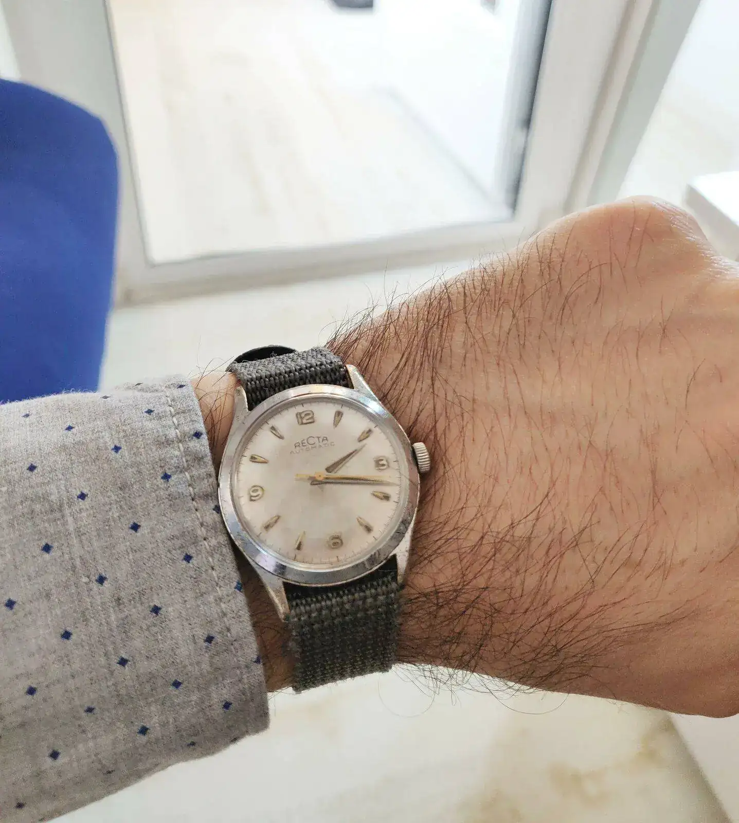 Recta es una marca muy poco vista por estas latitudes. Según tengo entendido dio el salto a la exportación en UK en los años 50 y precisamente yo lo compré a un inglés por eBay. Estaba bastante perjudicado y el movimiento solo funcionaba con remonte manual porque le faltaba una pieza. Pude encontrarla con cierta facilidad y tras pasar por mi relojero de confianza funciona perfecto y guarda un orden de marcha fantástico. Y aunque es pequeñito (34mm como otros muchos vintages) a mi me encanta porque además tengo la muñeca pequeña: