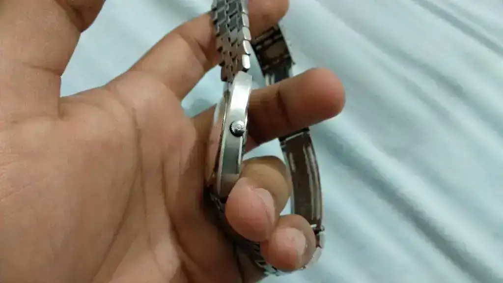 A mis ojos el reloj está bastante conservado, le di cuerda, parece que es manual y arrancó, pero la sentí muy dura, por lo tanto no le di mucho. El pase rápido, que se hace tirando hacia afuera funciona.