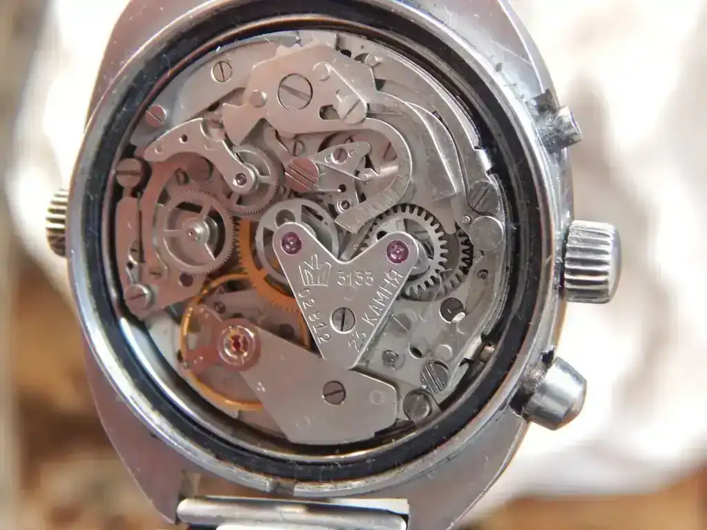 Inmediatamente hice clic en la siguiente fotografía, que mostraba el calibre al descubierto, y lo que encontré no me defraudó. Todos los detalles (demasiados para mencionarlos todos aquí) que me indicaban que había encontrado uno de los primeros Sturmanskies. Lo principal, el numero de serie de 5 dígitos en el puente del cronógrafo en forma de corazón, acompañado del logotipo de Poljot en ese mismo puente, y no en la pletina principal del reloj, como en las decenas de miles de ejemplares que saldrían de Moscú durante más de dos décadas.