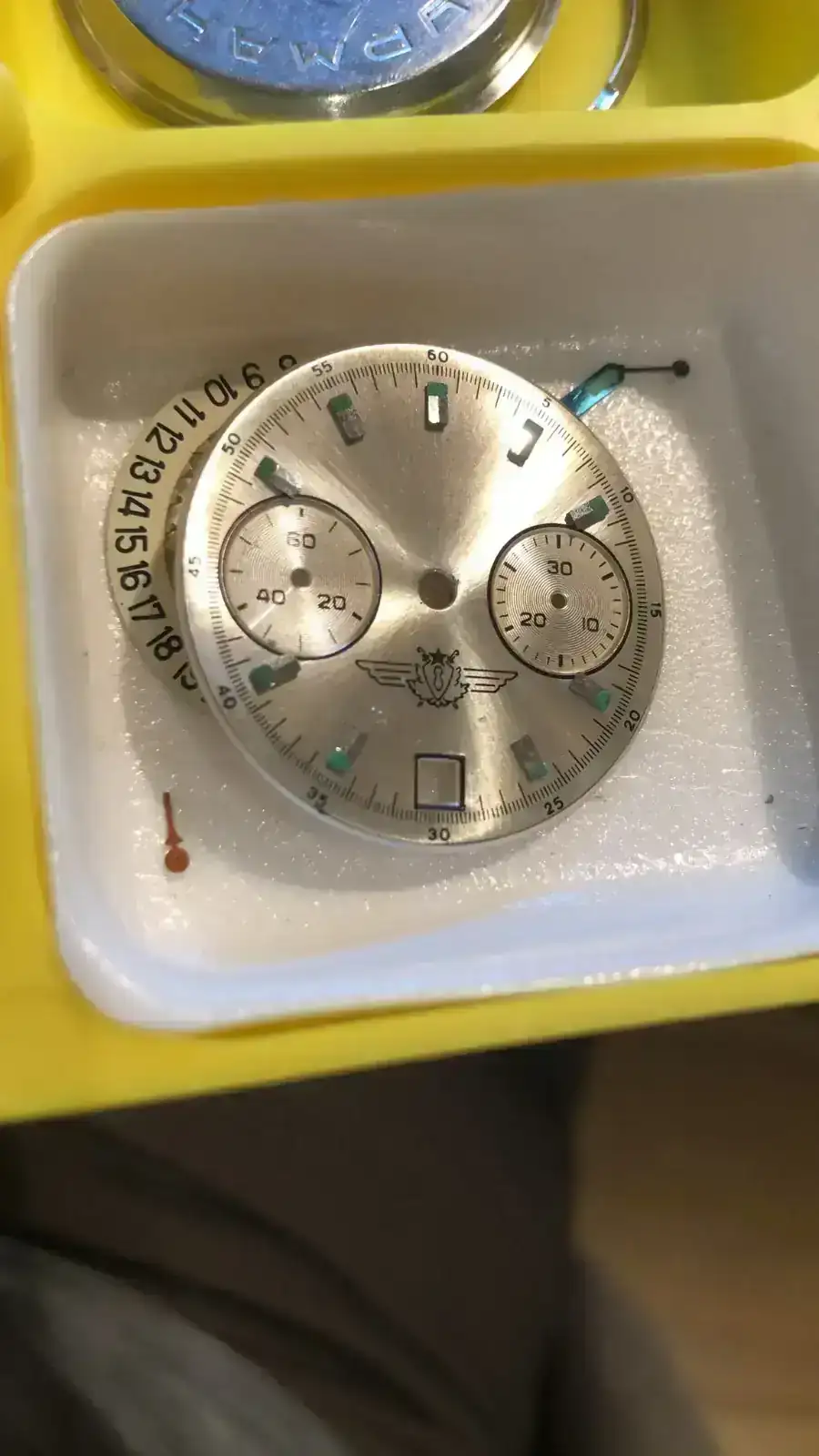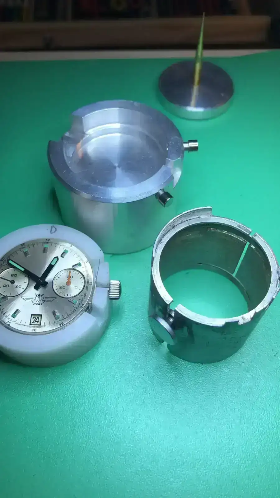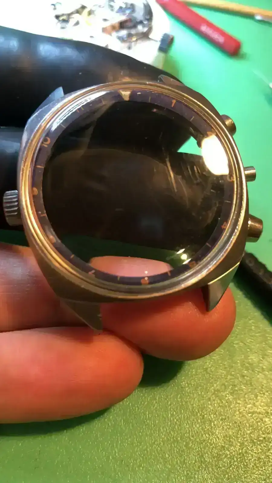 No tengo ni la paciencia ni las habilidades fotográficas de mi camarada de cervezas y chatarra Marius Jacob 😉, así que no pudo contaros de forma tan detallada el proceso de restauración del reloj. Baste señalar dos o tres detalles. El reloj funcionaba, aunque mal, y solo fue necesario desmontar y hacer una limpieza a fondo, cambiarle una palanca del cronógrafo que se rompió durante la restauración, sustituir el plexi por otro original conseguido gracias a otro amigo, e instalar un bisel antiguo, con sus letras rojas, y un pulsador de crono que, aunque de acero, por desgracia no se corresponde con la caja de primera generación. Esta es una de las características poco conocidas de estos sturmaskies tempranos: Los pulsadores de los primeros ejemplares eran del tipo de tornillo, y con las primeras modificaciones de diseño (en mi opinión combinando medidas para abaratar costes, como esta sustitución, con otras medidas para mejorar la calidad del diseño, especialmente en el calibre) además de modificar ligeramente el diseño de la caja, se sustituyeron estos pulsadores atornillados por los posteriores, que se fijan con un “circlip” que los hace mucho más difíciles de instalar y desinstalar. Por supuesto, encontrar uno de estos pulsadores originales de tornillo que se produjeron durante muy poco tiempo, es tarea poco menos que imposible…