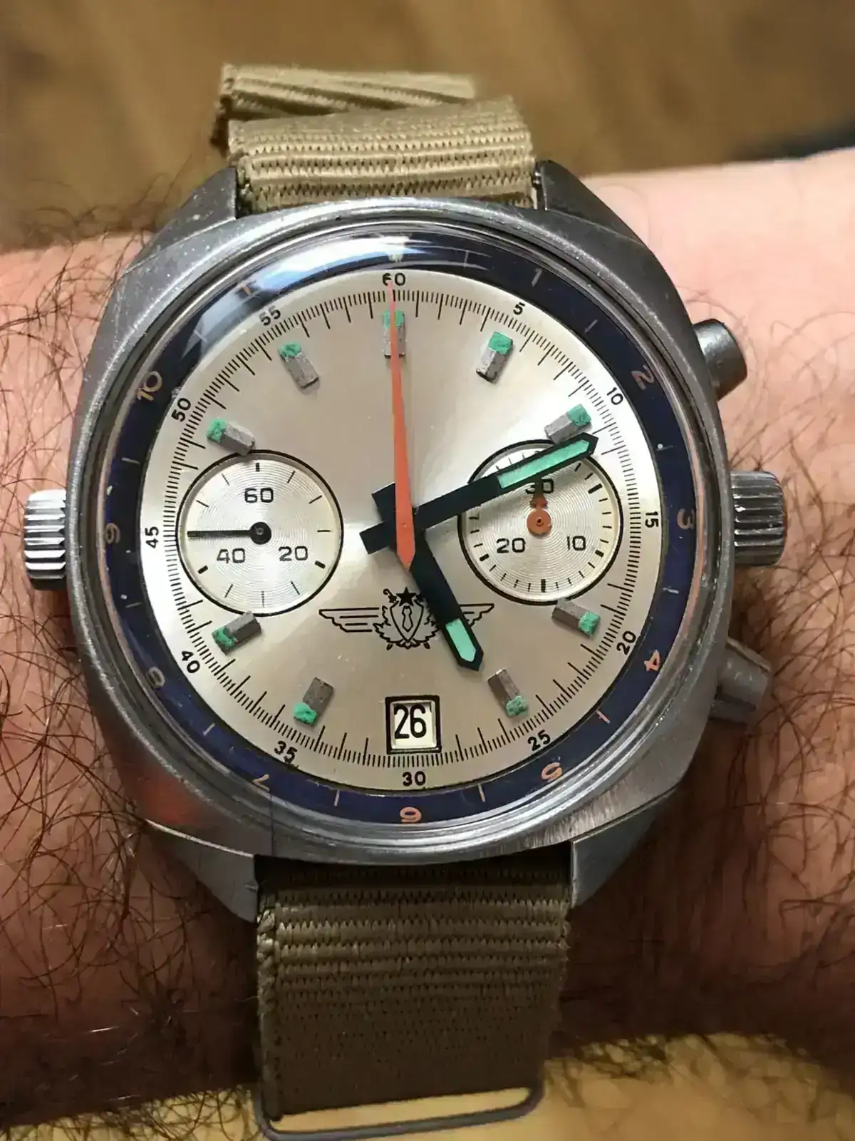 Por eso, en cuanto vi por primera vez la fotografía del reloj en un sitio de subastas de un país que vivió tras el telón de acero, di sin querer un salto en mi silla: Esa esfera con “pozos blancos”, como dicen los coleccionistas rusos, la tipografía diferente de la habitual en la pista de minutos, el bisel destrozado por la luz del sol pero correcto, y la caja de acero, esa caja que solo se fabricó por unos meses antes de que se introdujeran modificaciones y que es tan difícil de encontrar, y más en un reloj que no es un Okeah… todo concordaba, gritándome que había encontrado un tesoro.