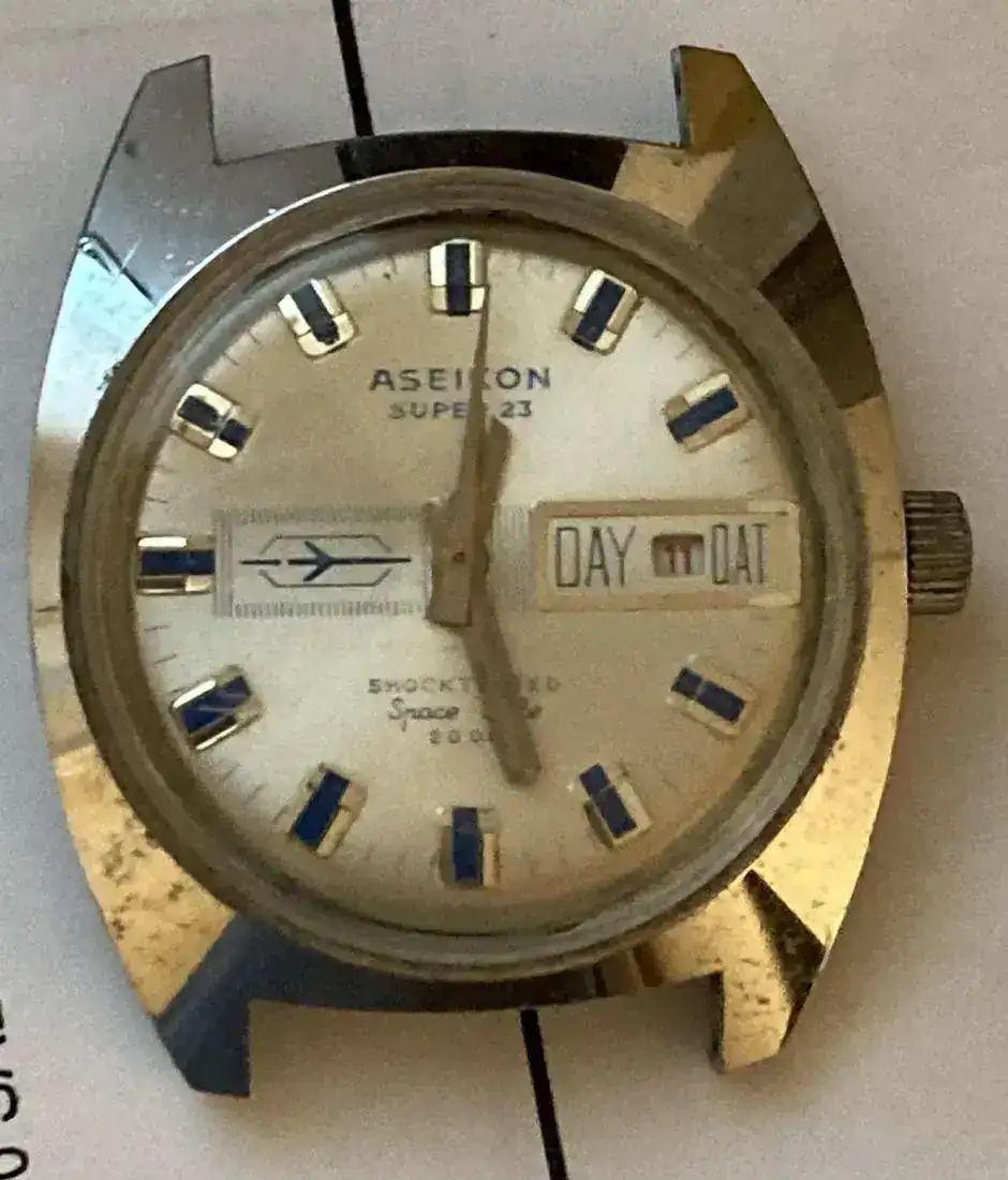 Eran enormeeeeeessss esos Aseikon. Anormalmente grandes en los '70 y '80. Además tenían un inusitado ( en algunos casos, no todos... ) armís sustancialmente mejor construido que los de Seiko, vaya paradoja. Y sus cajas, otra paradoja, se parecían escandalosamente a la de los Tressa y Ogival, que todavía en los '70 eran Swiss Made.
