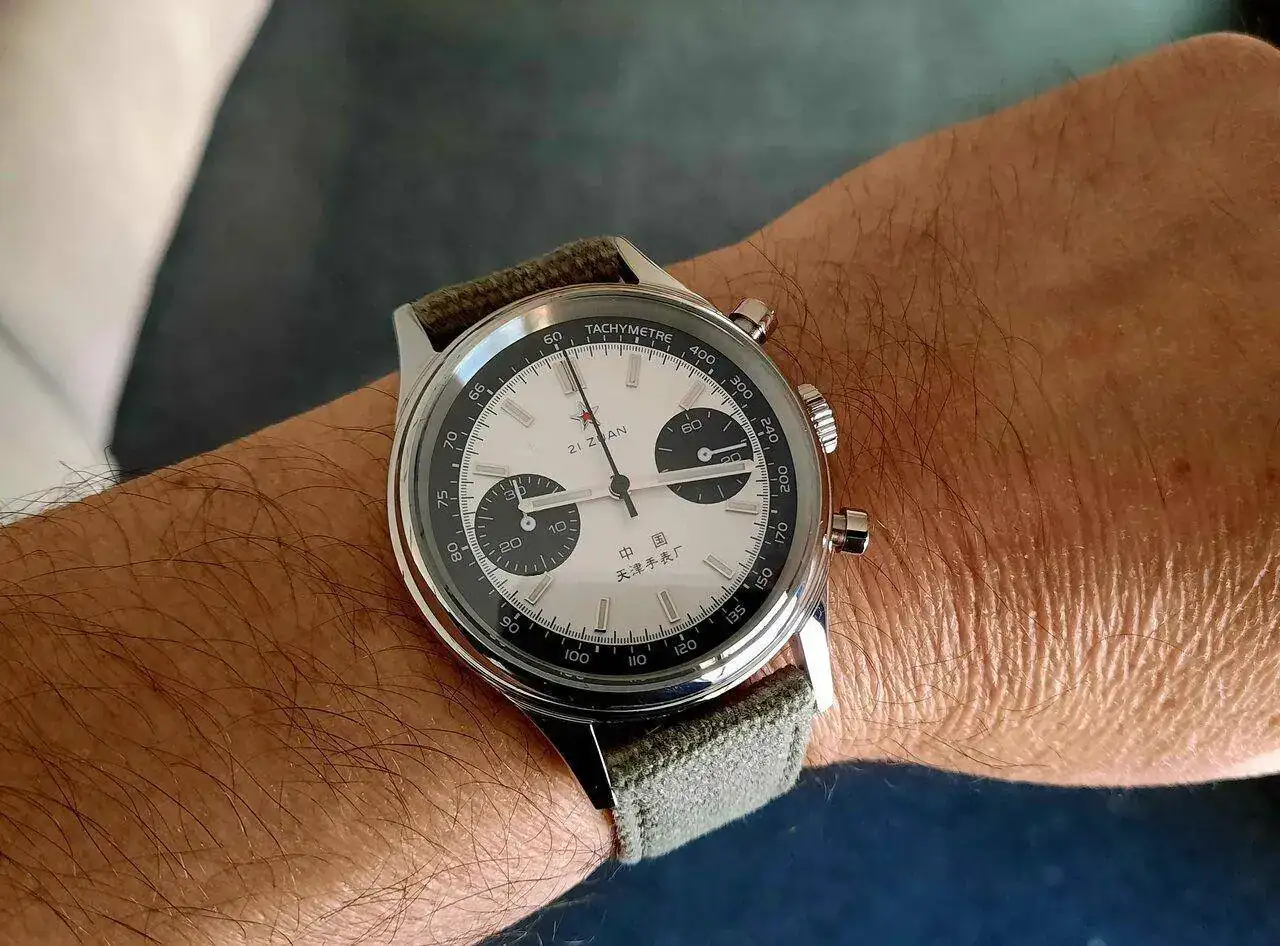 El estado és de 9,5 de 10. La maquinaria es una Seiko mecaquartz VK64, lo que para ser un reloj de cuarzo, tiene su puntillo ver la aguja del crono corriendo como un automático. Lo saco barato, barato para que salga rápido.
