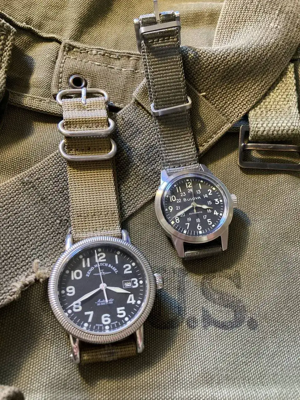 He hecho unas fotos con unas musette bag de 1944/45 de fondo, del US Army, que tengo por casa (colecciono algo de militaria de época) sin querer hacer apología de ninguna guerra ni ejército (en un mundo perfecto no existirían unas ni harían falta los otros) la intención es sólo mostrar el reloj ambientado, aunque el original como sabemos era algo más pequeño (32 mm creo). También fotos con un Zeno watch Nostalgia que tengo, bastante más grande.