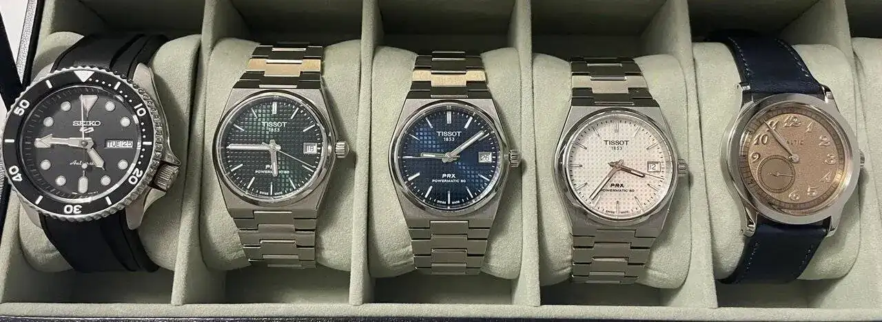 Supongo que la primera cosa que sorprenderá de esta pequeña caja es que el 3 de los 5 relojes sean el mismo modelo, el Tissot PRX Powermatic 80 en verde, azul y madreperla. El motivo es simple, hace un par de años decidí dejar de preocuparme demasiado por la ropa y buscar un modelo de camiseta, sudadera, pantalón, etc... y comprarlo en todos los colores, y pensé que quizás también me encajaría con los relojes, pero no ha sido así.