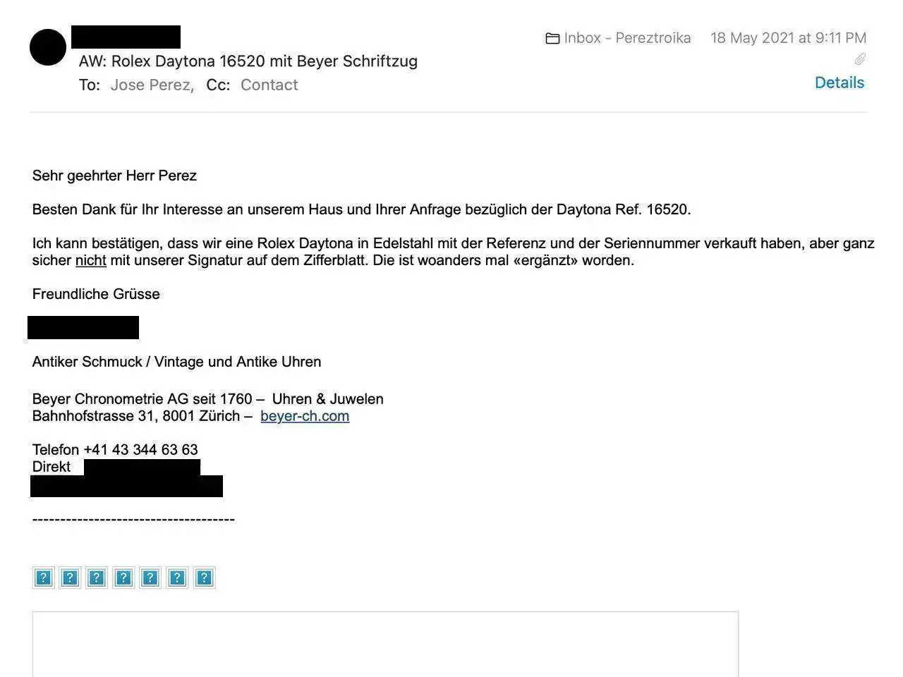El 27 de noviembre de 2018, Phillips Hong Kong subastó un inusual Rolex Daytona Ref. 16520 de 1991 (serie N) con rara esfera doble firmada 'Beyer'. Según la casa de subastas, se sabe que existen unas ocho piezas. Beyer, la relojería más antigua de Suiza, tenía una relación especial con Rolex, Patek Philippe y muchas otras marcas. Situada en mi ciudad natal, Zúrich, en la mundialmente famosa Bahnhofstrasse, Beyer fue la elección natural cuando compré mi primer reloj caro a finales de 1999, un Breitling Navitimer Fighters (A13330). A principios de 2021, comencé a tener dudas sobre los Zenith Daytona con diales 'Beyer', así que contacté a la gente de Beyer para preguntarles si esos diales con doble firma eran reales. La respuesta de Beyer fue inequívoca...