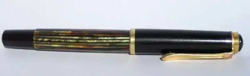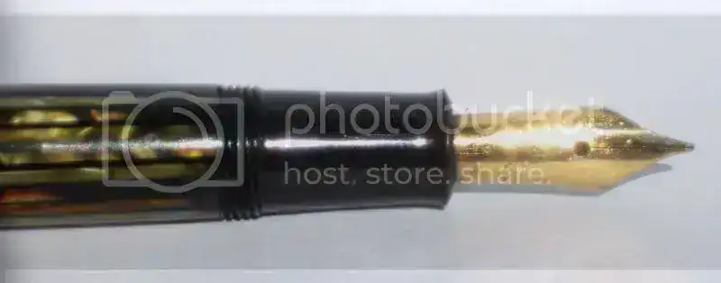 El culotte y la sección de agarre, así como el top cap, son de resina de color marrón "tortuga" (más bien parece chocolate: dan ganas de morderle y todo....), eso sí, resina especial o noble.......según la escueta información técnica con que se presenta.ya que es en celuloide y (deseo/espero) que ebonita en los remates... pues con el tiempo y el uso se quedará tal cómo la antigua.
