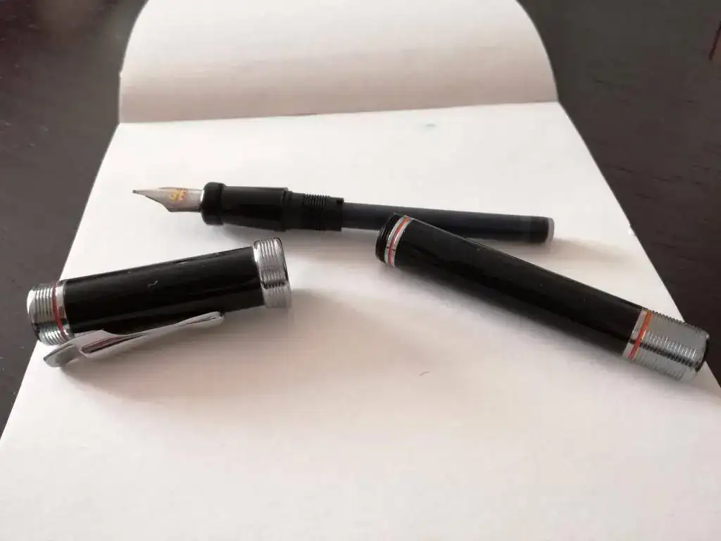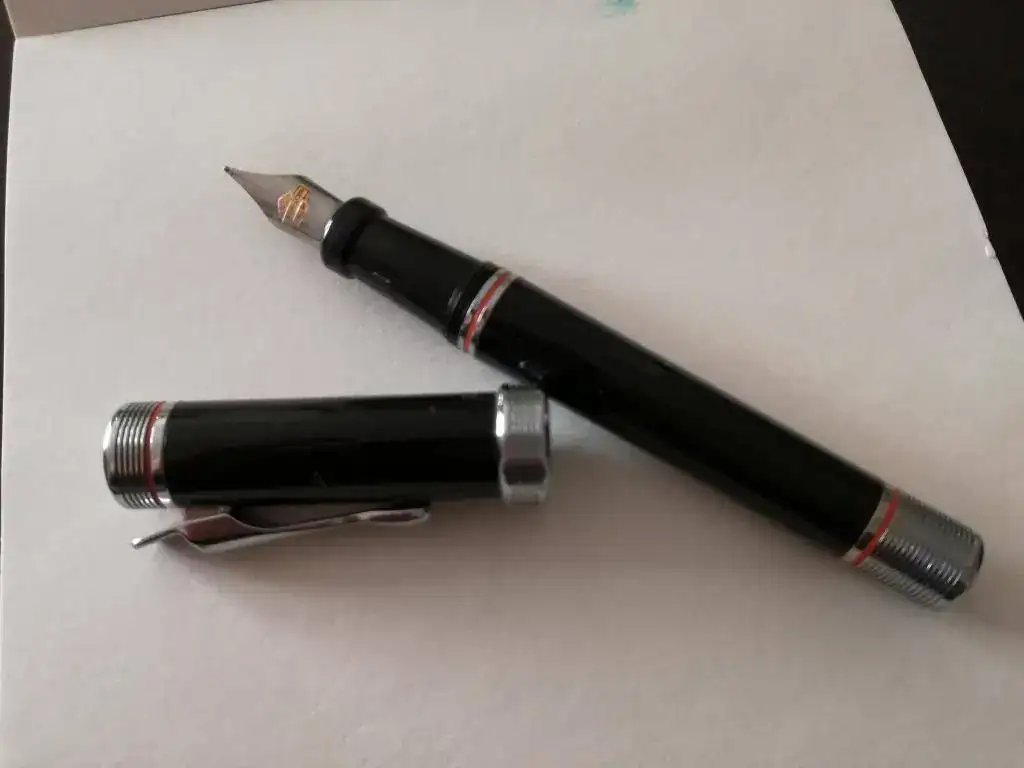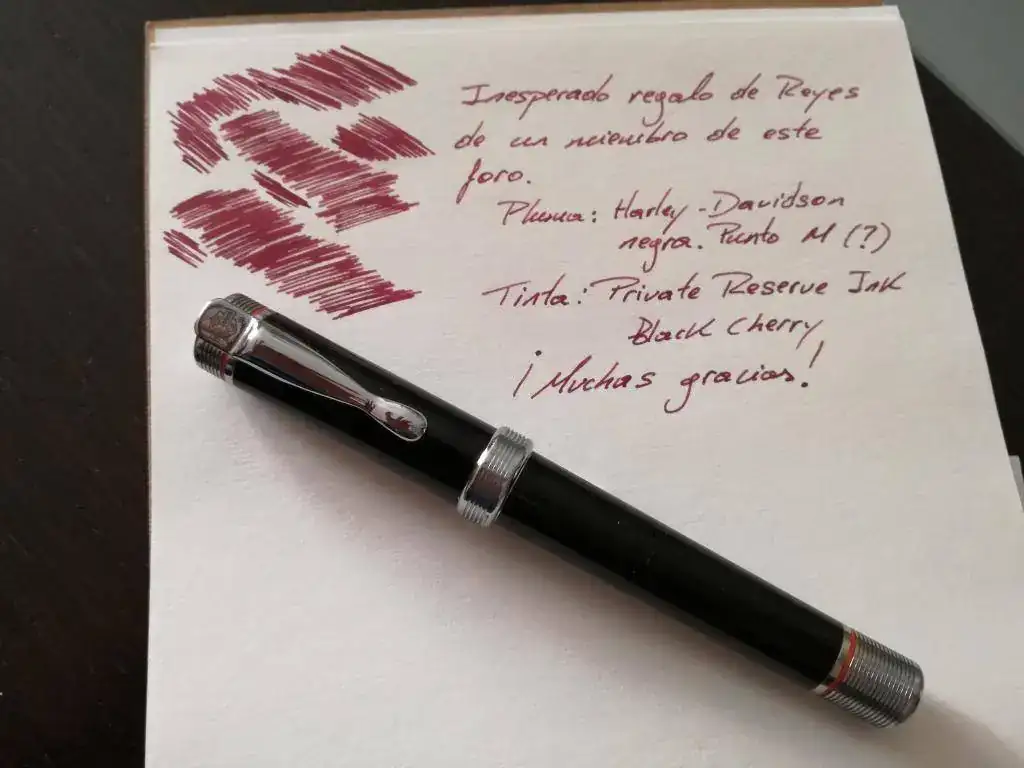 Algunos recordaréis un hilo de hace unos meses titulado "Recuperando la Harley" (iniciado por Javier Martín) en el que comenté que yo había tenido una y que me había desaparecido misteriosamente en el trabajo. Pues bien, un forero de pro, el Sr. Audio, tuvo a bien no sólo compadecerme por mi pérdida, sino también enviarme un maravilloso ejemplar de pluma Harley Davidson que tenía en su casa. Y quiso Fortuna (y el tino del Sr. Audio) que la recibiera justito a tiempo para disfrutarla en Reyes, después de lavarla y entintarla convenientemente.