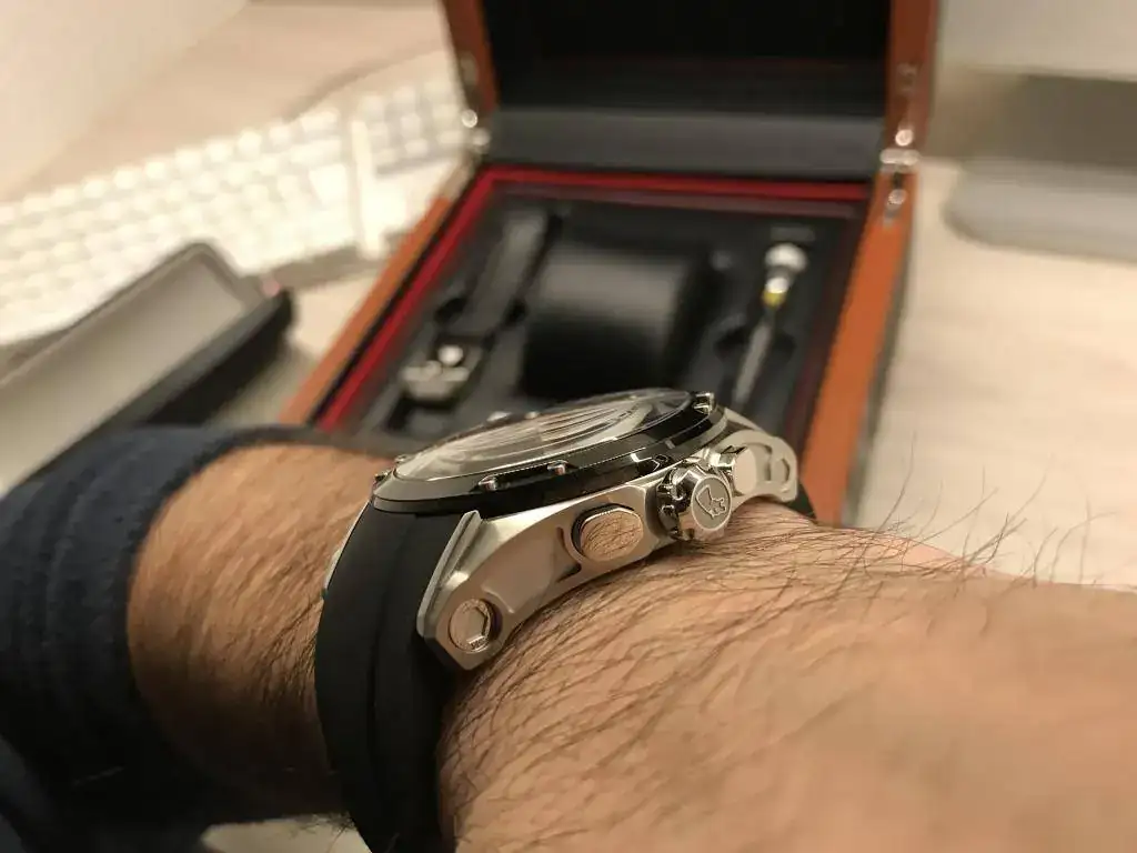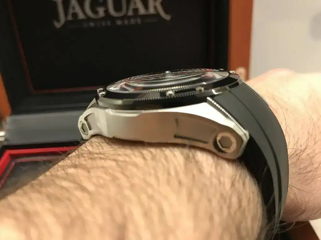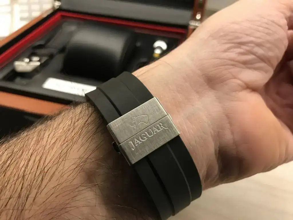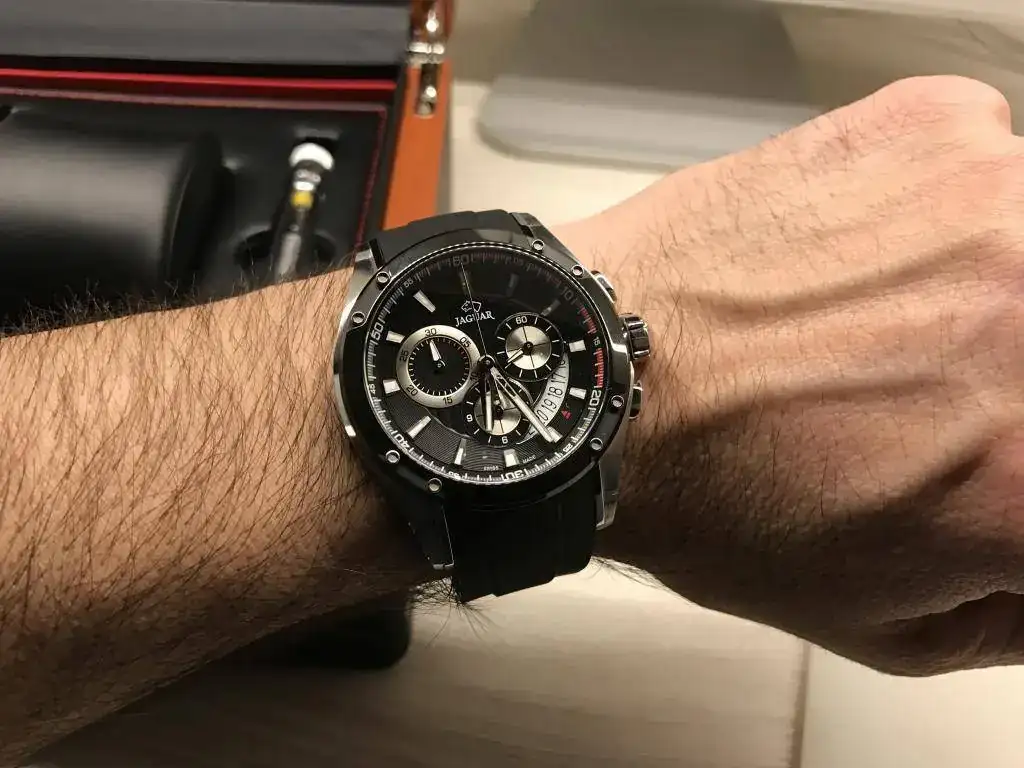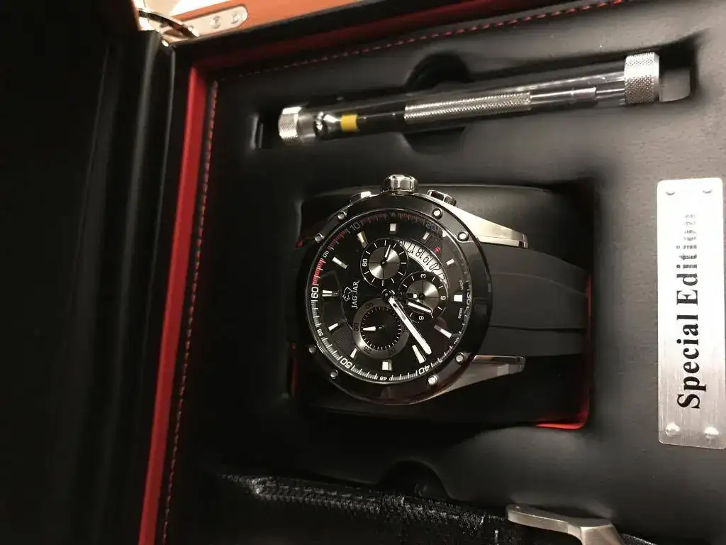 Es un Jaguar J688, cuarzo suizo, caja de 45mm con cristal de zafiro, crono y fecha. Va con una correa de gran calidad de caucho con deployante y otra correa de piel, junto un destornillador para el cambio y todo en una bonita caja que está muy bien acabada.