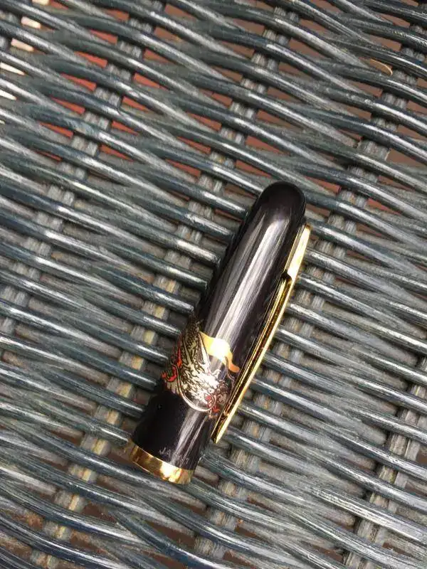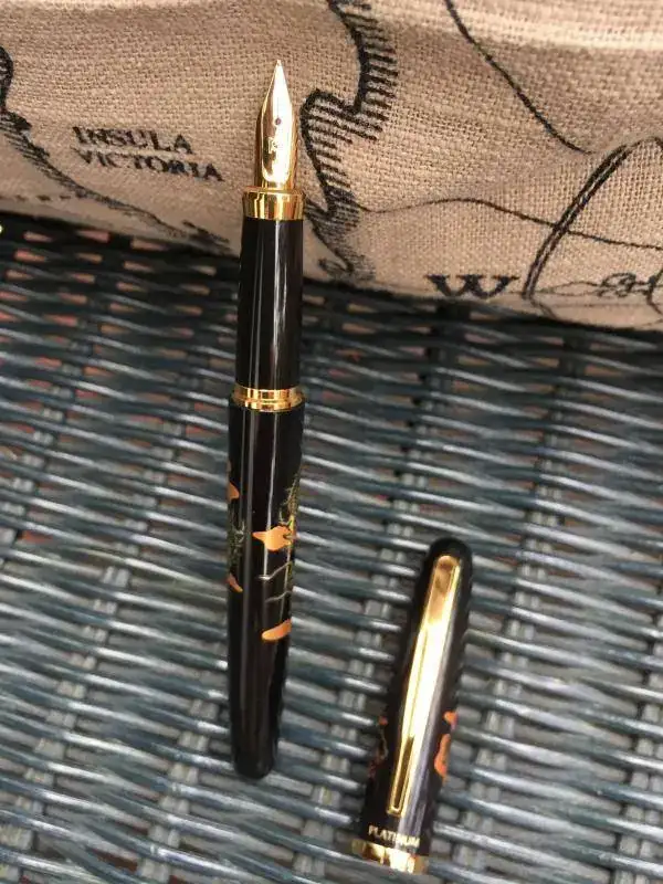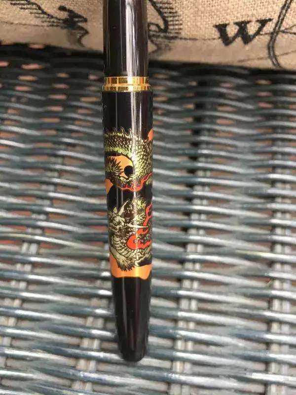 La siguiente es una Platinum Modern Maki-e Soryu. En el cuerpo (de resina) dos dragones entrelazados que simbolizan el principio y el final del mundo. Plumín de acero bañado en oro, cierre por presión, carga por cartucho o convertidor, longitud cerrada 138m.