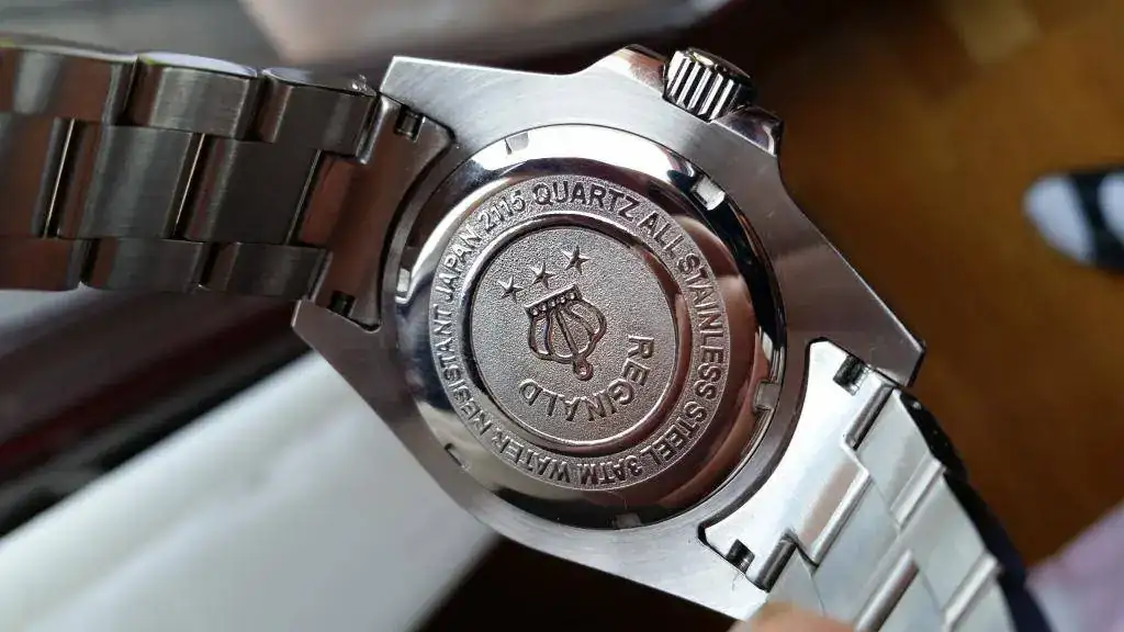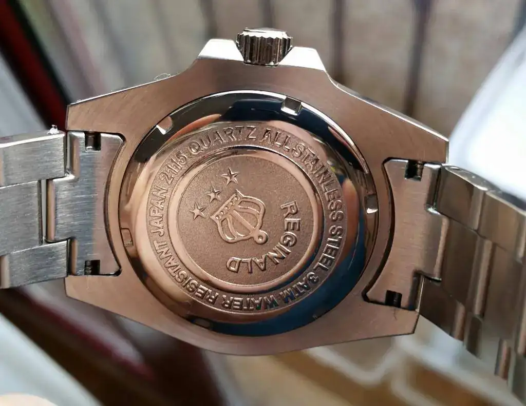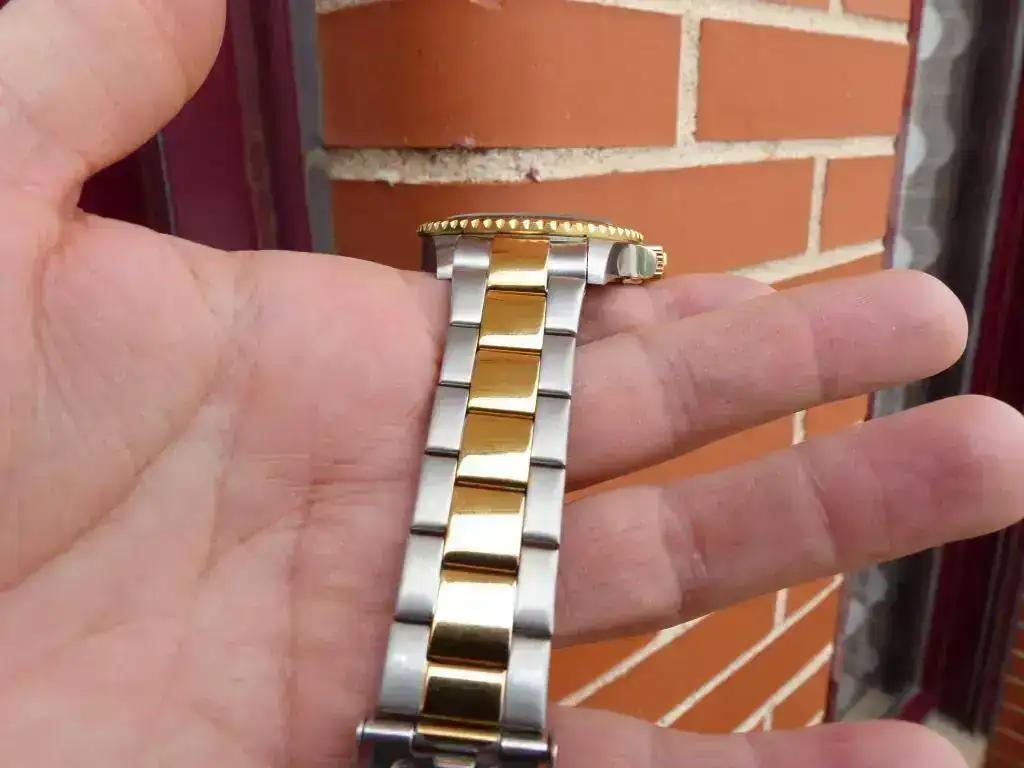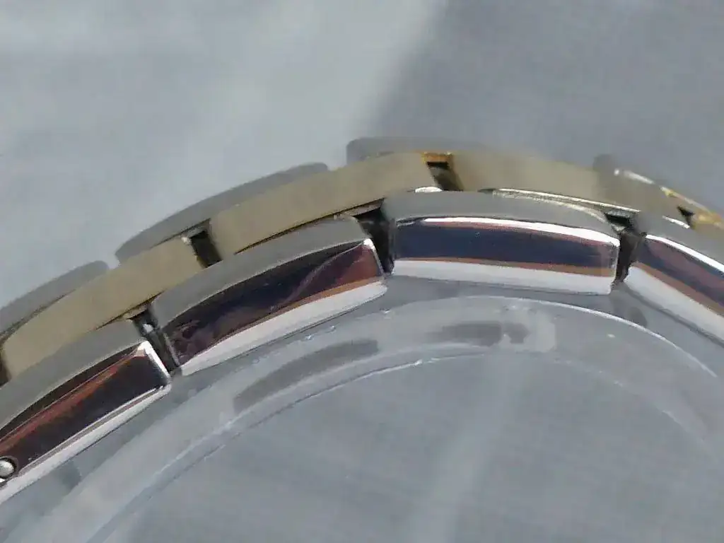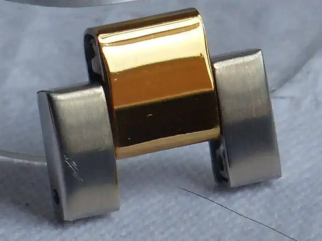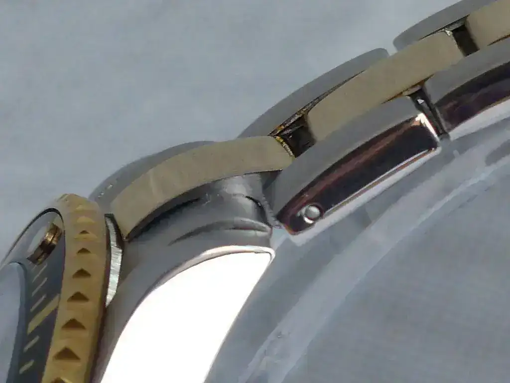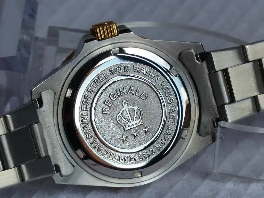 ¿Entonces que pasa no es un Reginald falso? No creo, es un "nuevo modelo" lanzado por la marca tras lanzar en el mercado una versión maciza en el armis y los end links y ganar la confianza de lo compradores, lanzan este modelo para reducir costes y aumentar ingresos a costa de los compradores inexpertos (casi no me he dado cuenta yo), ya que por fuera parece muy macizo el armis y todos sabemos que un armis de chapa doblada tiene menos coste de fabricación y esta valorado menos y como si no fuera bastante han aumentado el precio del producto. Otro cambio esta vez para mejor es que el bisel parece que tiene menos juego y las manecillas y los indices son algo mas grandes lo que hace leer la hora mas fácil. No se que tal va a aguantar este chapado oro en el tiempo.